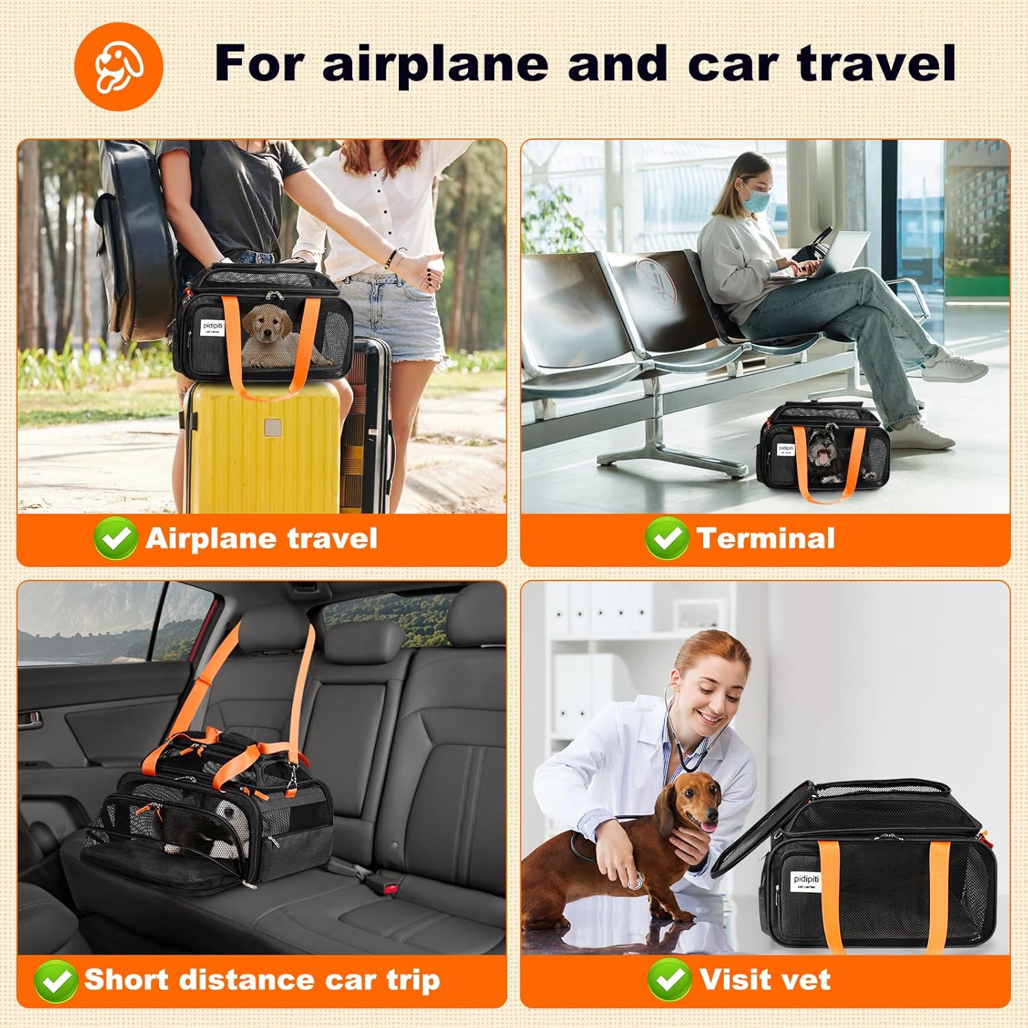 5.【Buy one,fly three airlines】This carrier match size requirement of three airlines(Spirit/ Southwest / air canada ),so you don’t need to buy another one for those airlines.This carrier also can be used for a short distance car travel,like a vet visit.