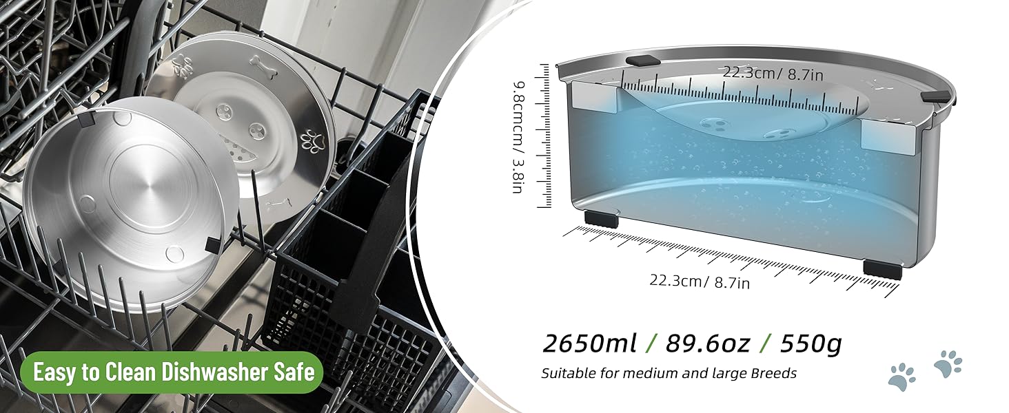 The bowl comes with a non spill water feeder, which can effectively prevent water and food from spilling or leaking. Also a slow water feeder can help your pet drink water more safely and healthily.