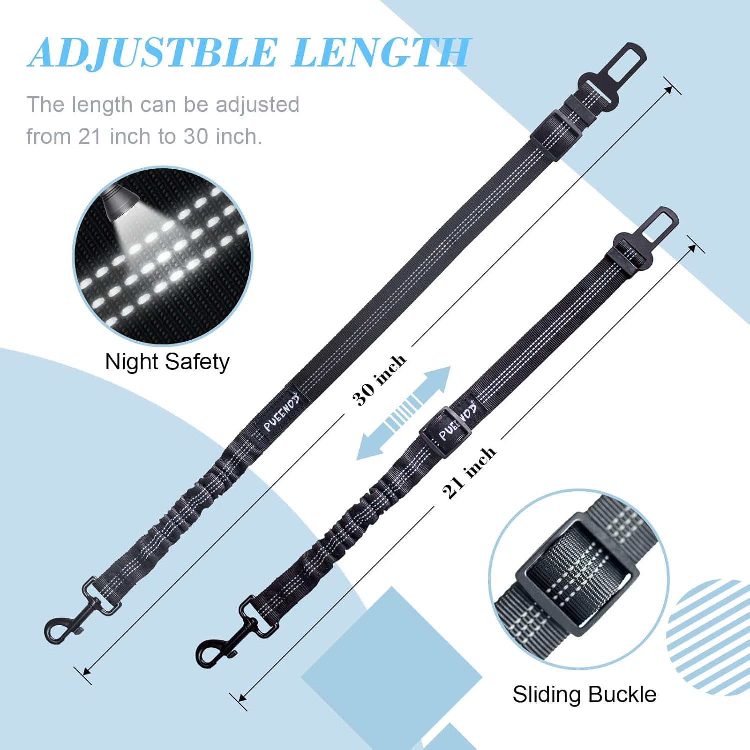 PUBBNOD 2 packing dog car seat belt is made of strong nylon fabric, high quality zinc alloy swivel buckle, rust-proof hook and stainless steel clip. very strong and durable. Adjustable strap and elastic buffer design can protect dogs from sudden braking or sharp turns. The seat belt strap can be adjusted to a desired length, perfect for all breeds of dogs or pets.