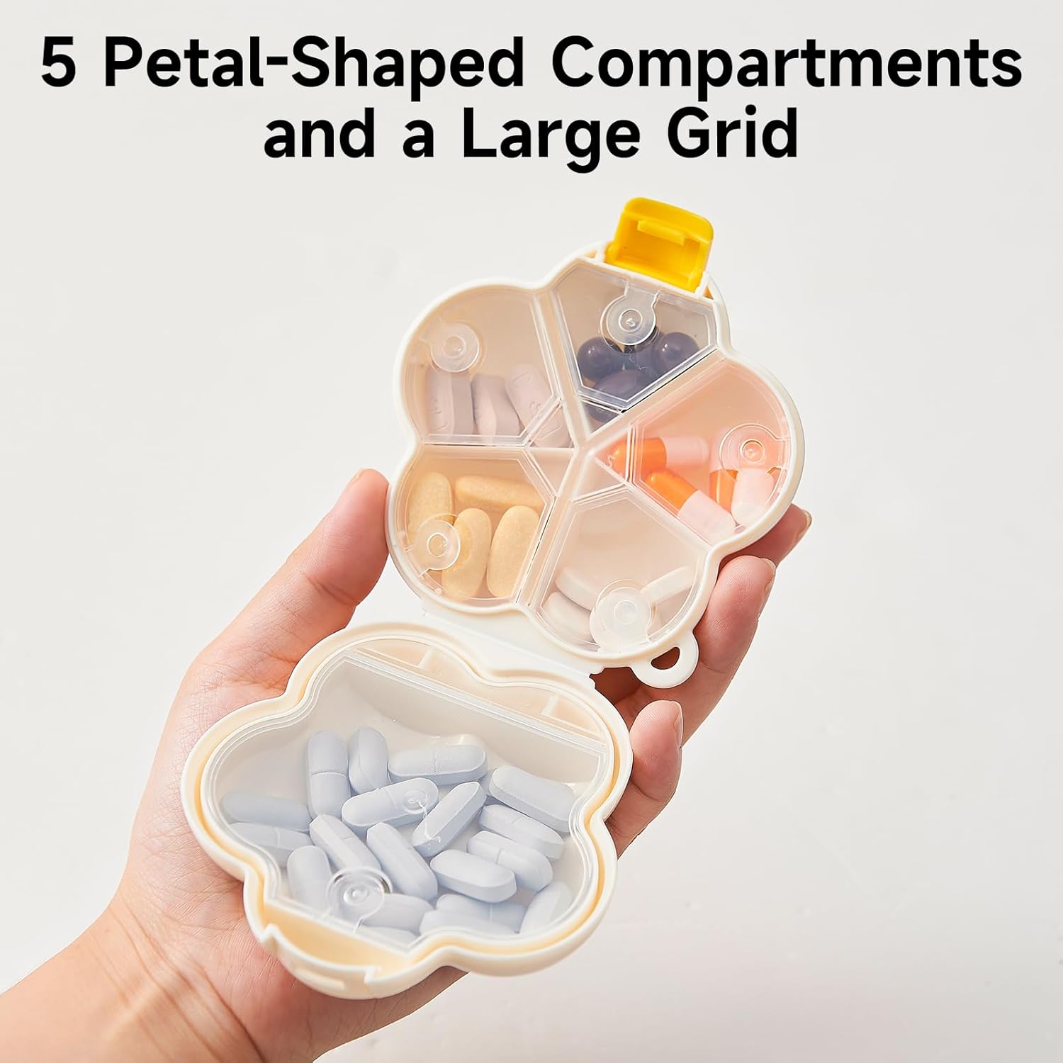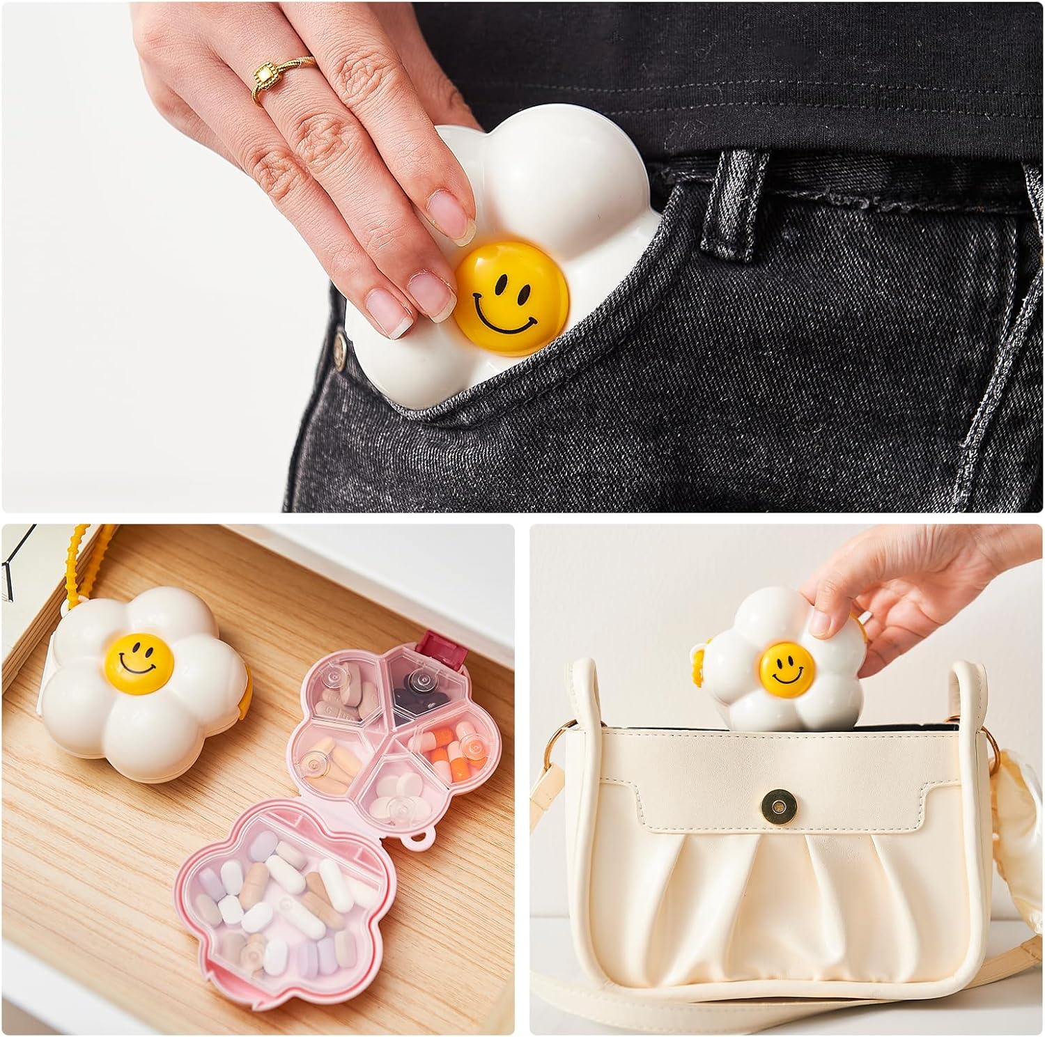 Food Grade Material – These cheerful pill cases feature petal-shaped smiley designs, made from food Grade & BPA free plastic, safe for storing vitamins, fish oil, and daily medications.
