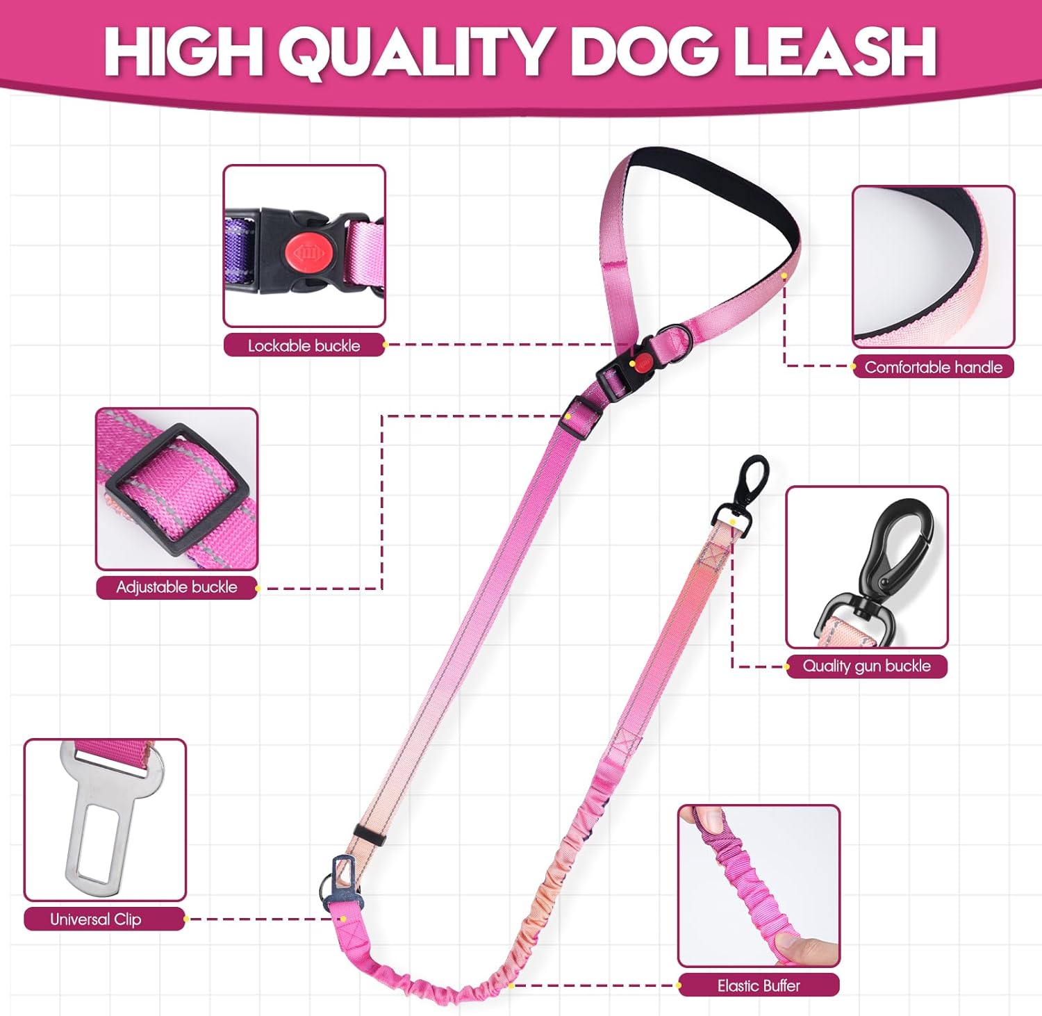 【Three-in-one design for all scenarios】Combines car seatbelt, seat anchor strap, and nighttime leash functions: can be secured into the car seatbelt slot, hung on the seat headrest, or used directly as a leash, easily adapting to diverse scenarios.