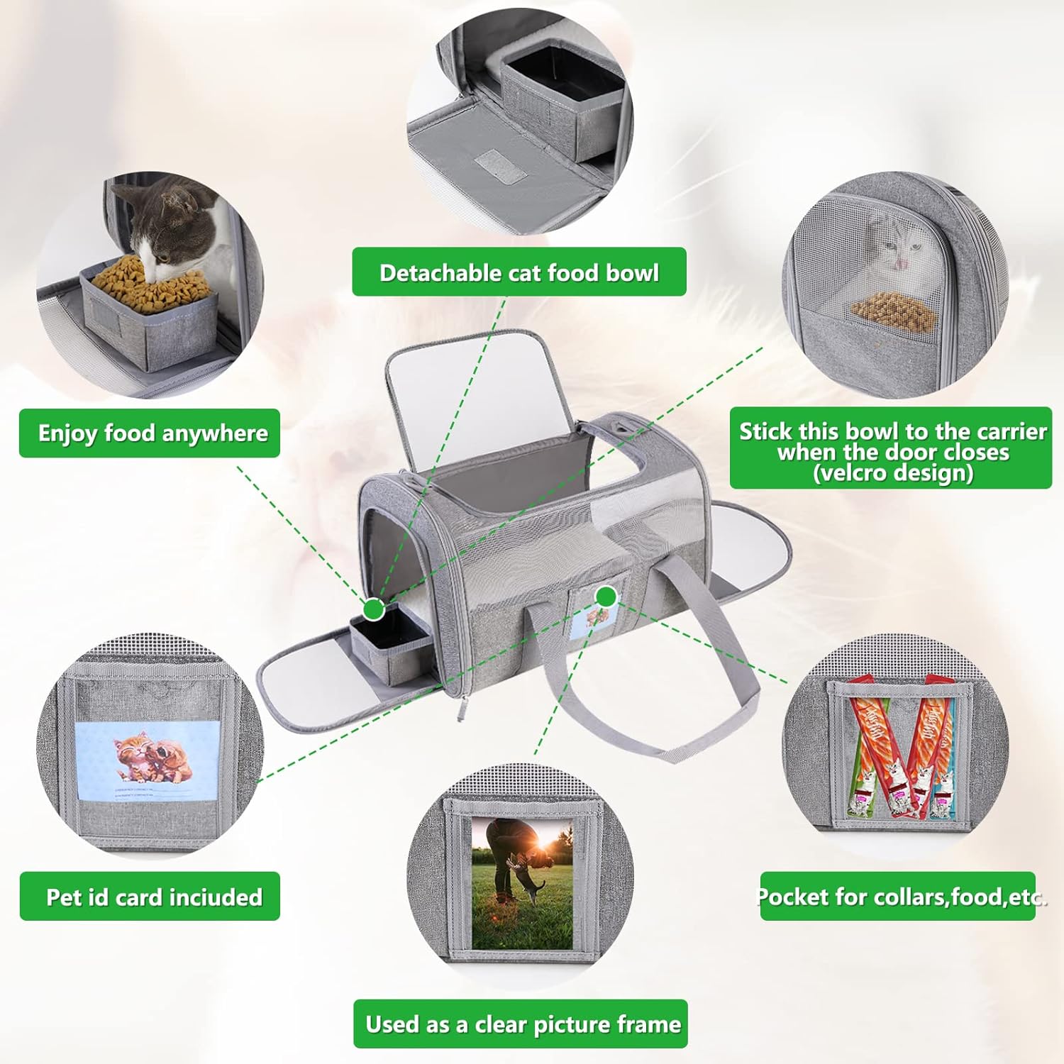 💐【𝐃𝐮𝐫𝐚𝐛𝐥𝐞 & 𝐂𝐨𝐦𝐟𝐨𝐫𝐭𝐚𝐛𝐥𝐞】The large cat carrier comes with a collapsible food bowl, and also comes with a comfortable soft washable fleece pad for your pet to lay on. The pet carrier comes with a removable base insert, which creates a solid surface for your pet to stand on, along with a removable & hand washable cozy fleece pet bed, which offers a cozy sleeping space for your traveling pet