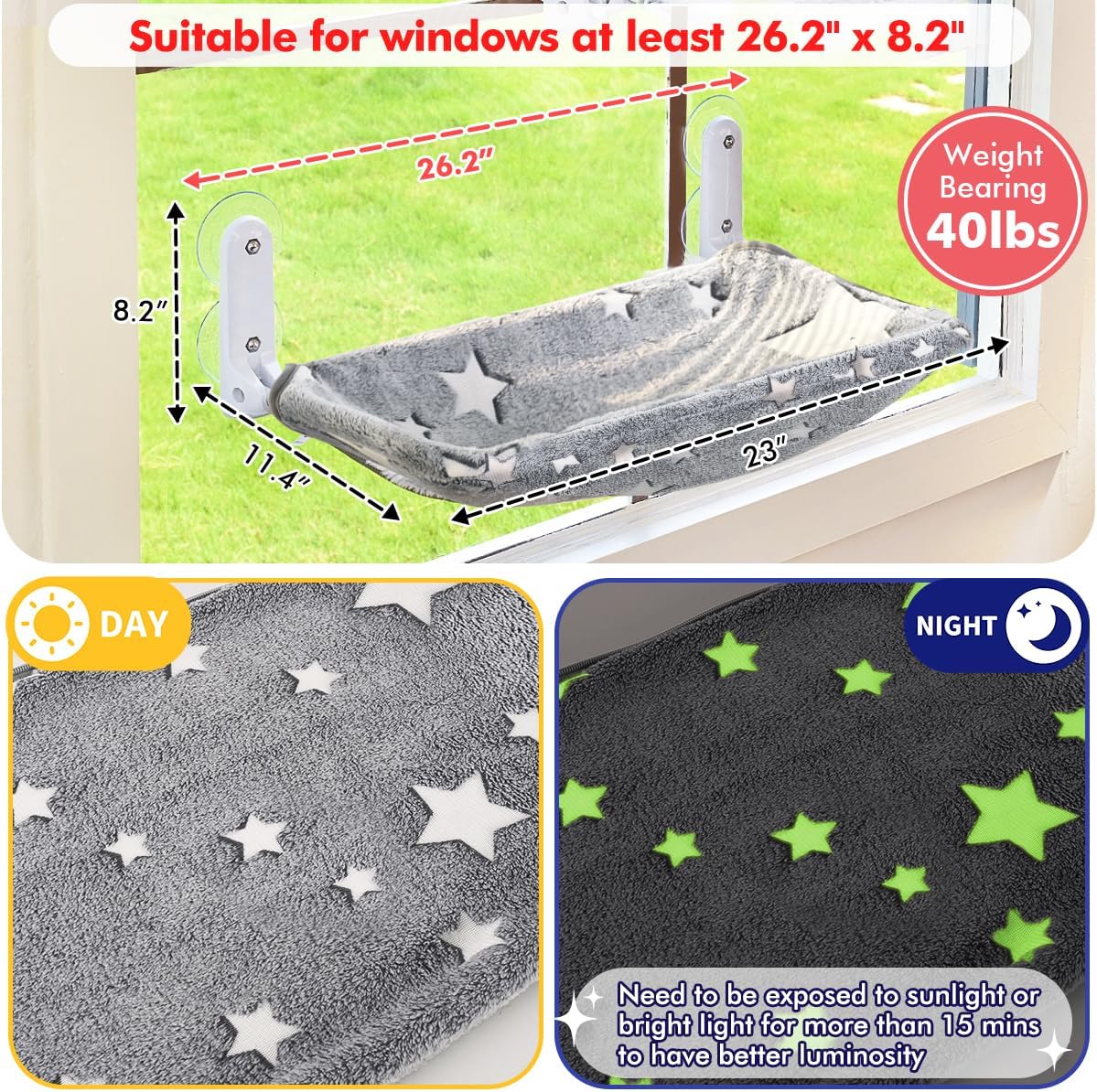 2PC Cat Window Perch, Glow in The Dark Cordless Foldable Pet Hammock Bed for Window with Sturdy Metal Frame, Glowing Stars Pattern Resting Seat for Indoor Cats (2PC Stars – L)