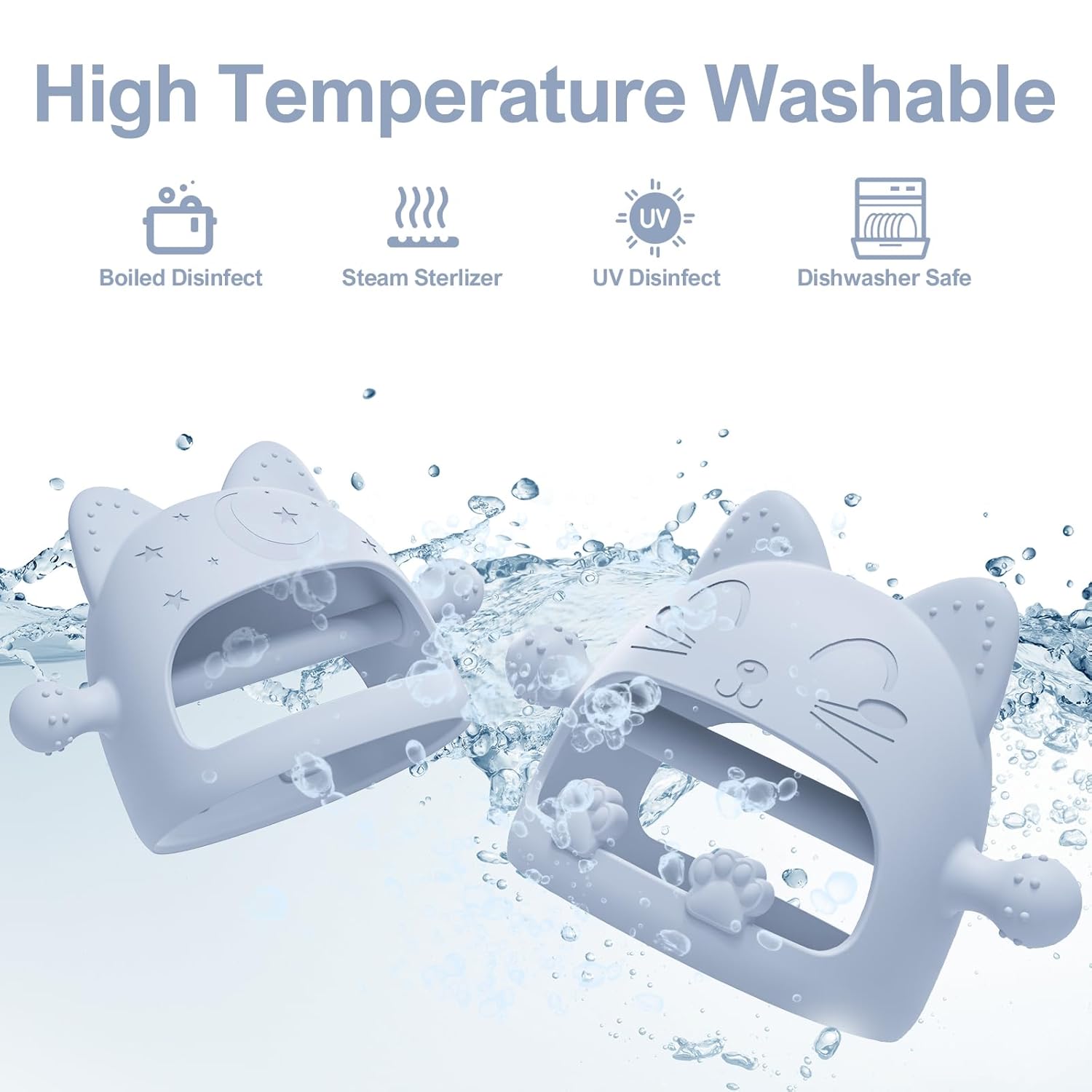 【Teething Toys For Babies 0-6 Months】Our cartoon cat baby teether is specially designed for newborns, the teether toys imitates a nipple shape on both sides,which may help babies transition from breastfeeding or bottle feeding to chewing on a teething toy,and soft silicone touch points on the top are designed to accommodate baby’s bite in different directions. This design element can provide a familiar feel for babies and make them more comfortable with the teether