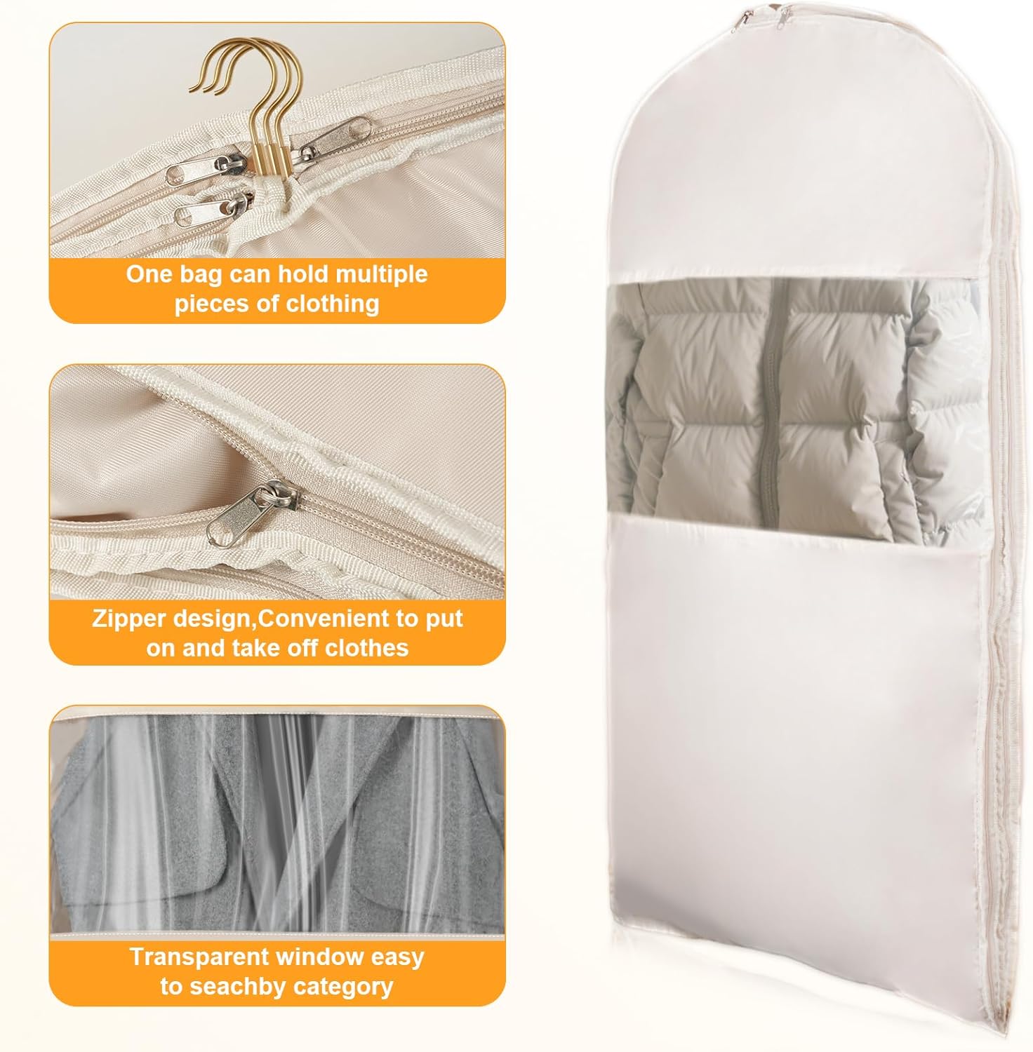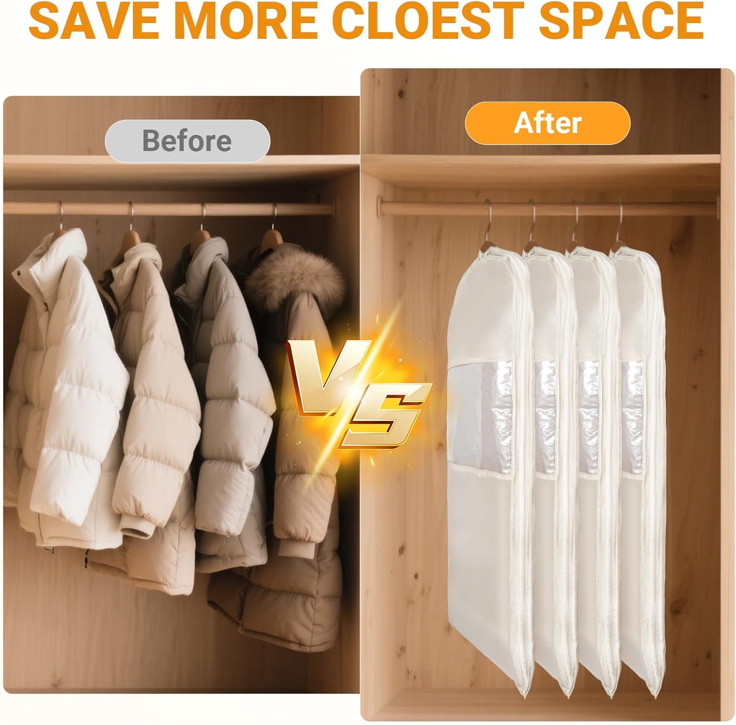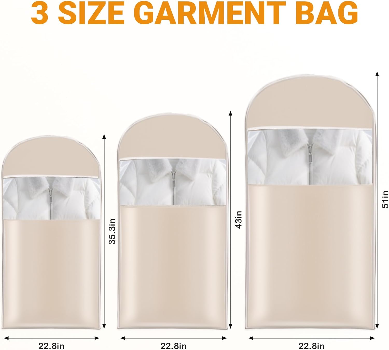 3-Pack Space Saving Hanging Garment Bag with Self Compression Zipper: This set includes M (35.3×25.8in), L (43×23.8in), and XL (51×2.8in) sizes, fitting clothes from hip to calf length. Perfect for organizing coats, down jackets, and suits while maximizing closet space