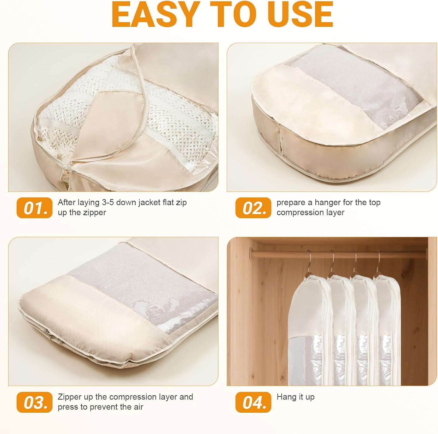 Effortless Compression with No Tools Needed: These compression bags for storage use a self-compression zipper—just zip the inner closure, then compress with the outer zipper (no vacuum required). Shrink bulk to save 50% closet space, ideal for seasonal storage
