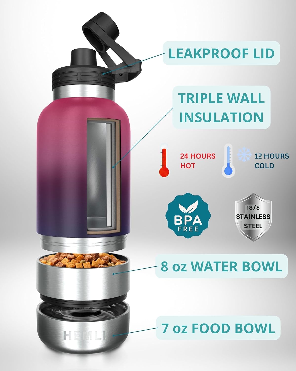 Dog Travel Water Bottle – This 32 oz. travel water bottle for dogs has everything covered. The body of this pet water bottle uses stainless steel double-walled, vacuum-sealed technology that will keep your water cold for up to 24 hours. The size is perfect for both large and small dogs.