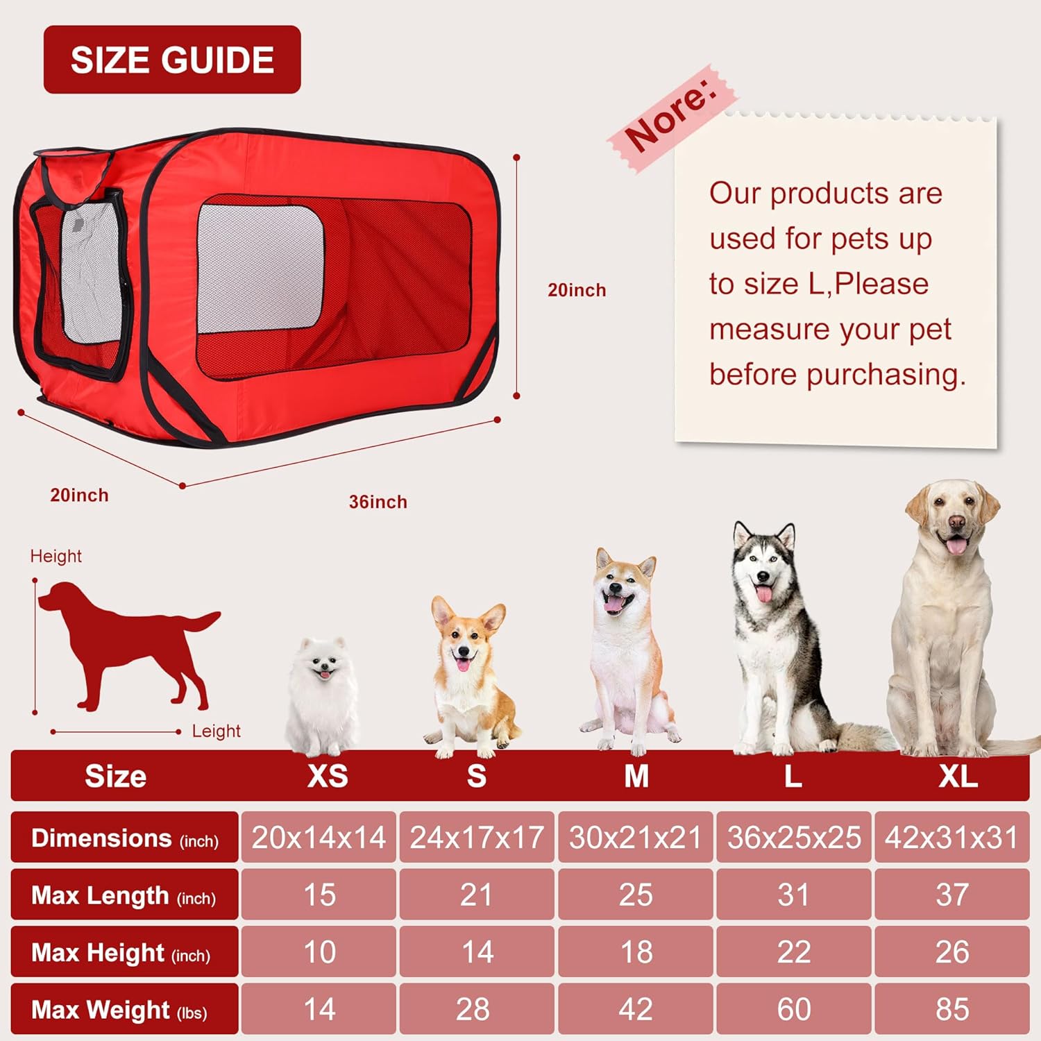 【Product Size 】36.22″L x 20.48″W x 20.48″H. The recommended maximum pet weight is 55 lbs.Please don’t choose the pet crate only based on weight but also reference your pet’s length and height.The kennel can be partially collapsed (laying flat) to a space-saving 38″ x 0.5″ size, ideal for storing under a bed, against a wall, or leaning against furniture.portable dog kennel,foldable dog crate,dog crate