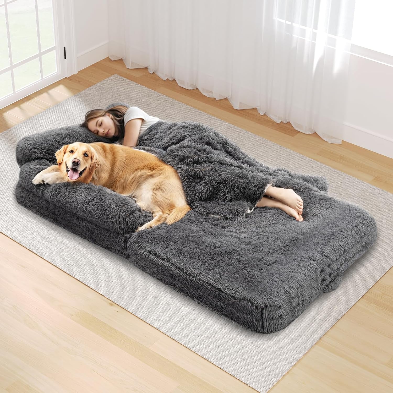 72″ Foldable Human Dog Bed for Adults, Fluffy Faux Fur with Blanket, Orthopedic Washable Dog Bed with Memory Foam and Water Repellent Liner Extra Large Thick for Pet