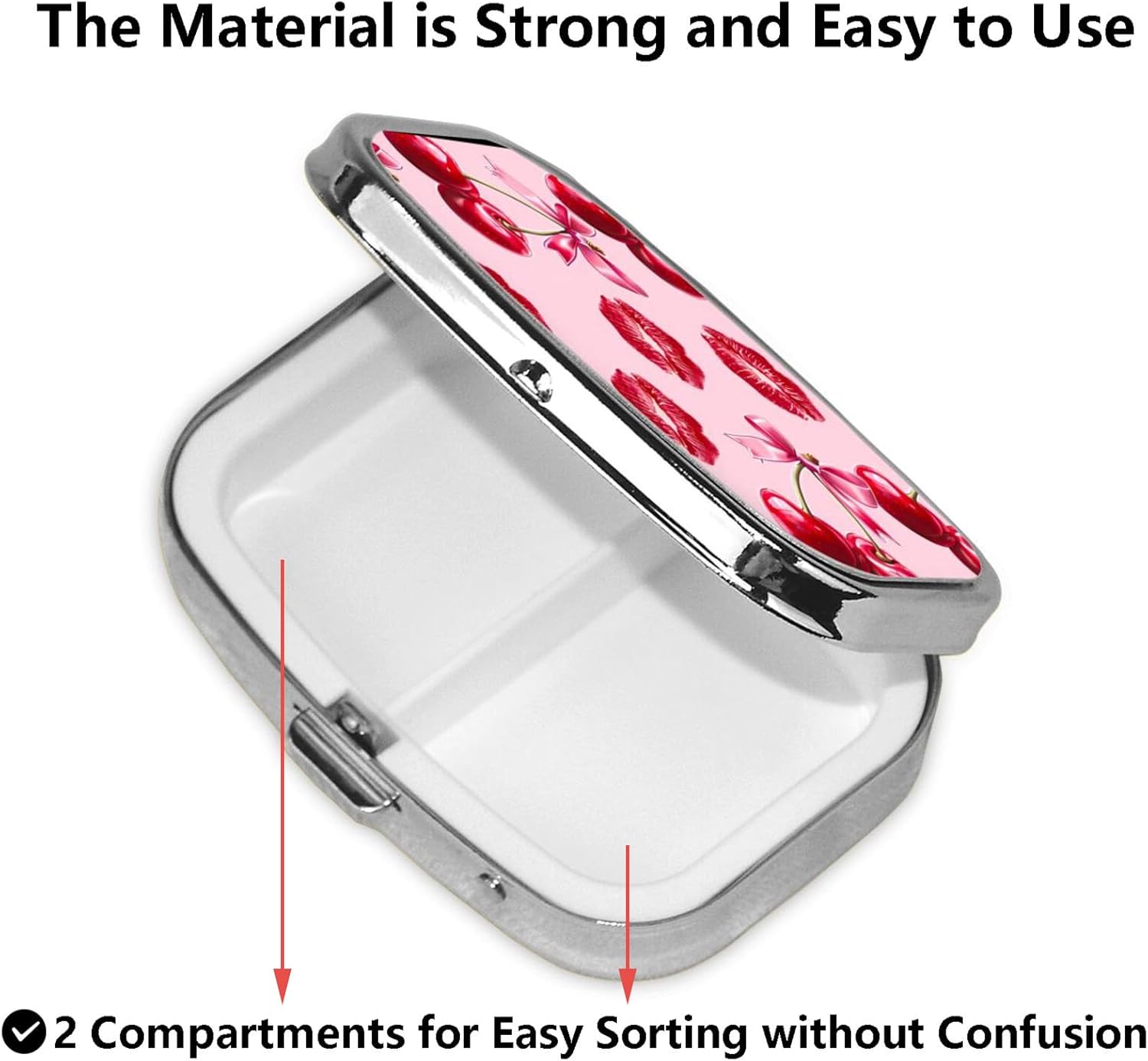 ABLESKY Pill Box, 2 Compartment Pill Organizer Case for Pocket or Purse, Small Portable Metal Travel Medicine Box with Mirror, Daily Vitamins Fish Oil Container-Cherry Pink Bow with Red Lips