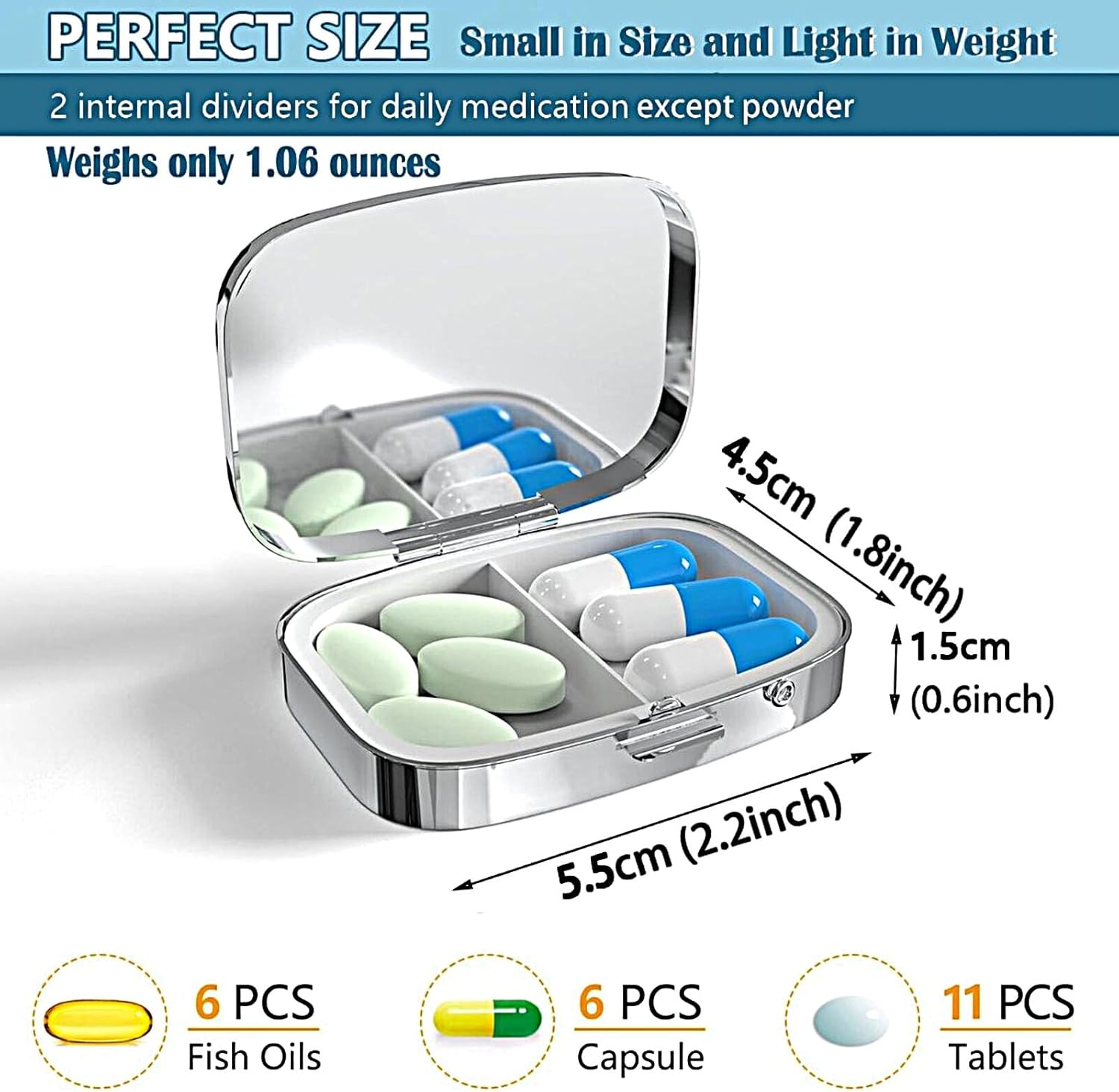 【Compact and Portable】Retro cute decorative rectangular portable pill box is 2.2*1.8*0.6 inches and weighs only 1.06 ounces. It has the fit size design, takes up very little space, and can just fit in the palm of the hand. It is small, portable size makes it easy to carry in your pocket or purse, providing a convenient solution for organizing your daily medication. With 2 compartments, it helps separate your day and night doses, ensuring you take the right medication at the right time