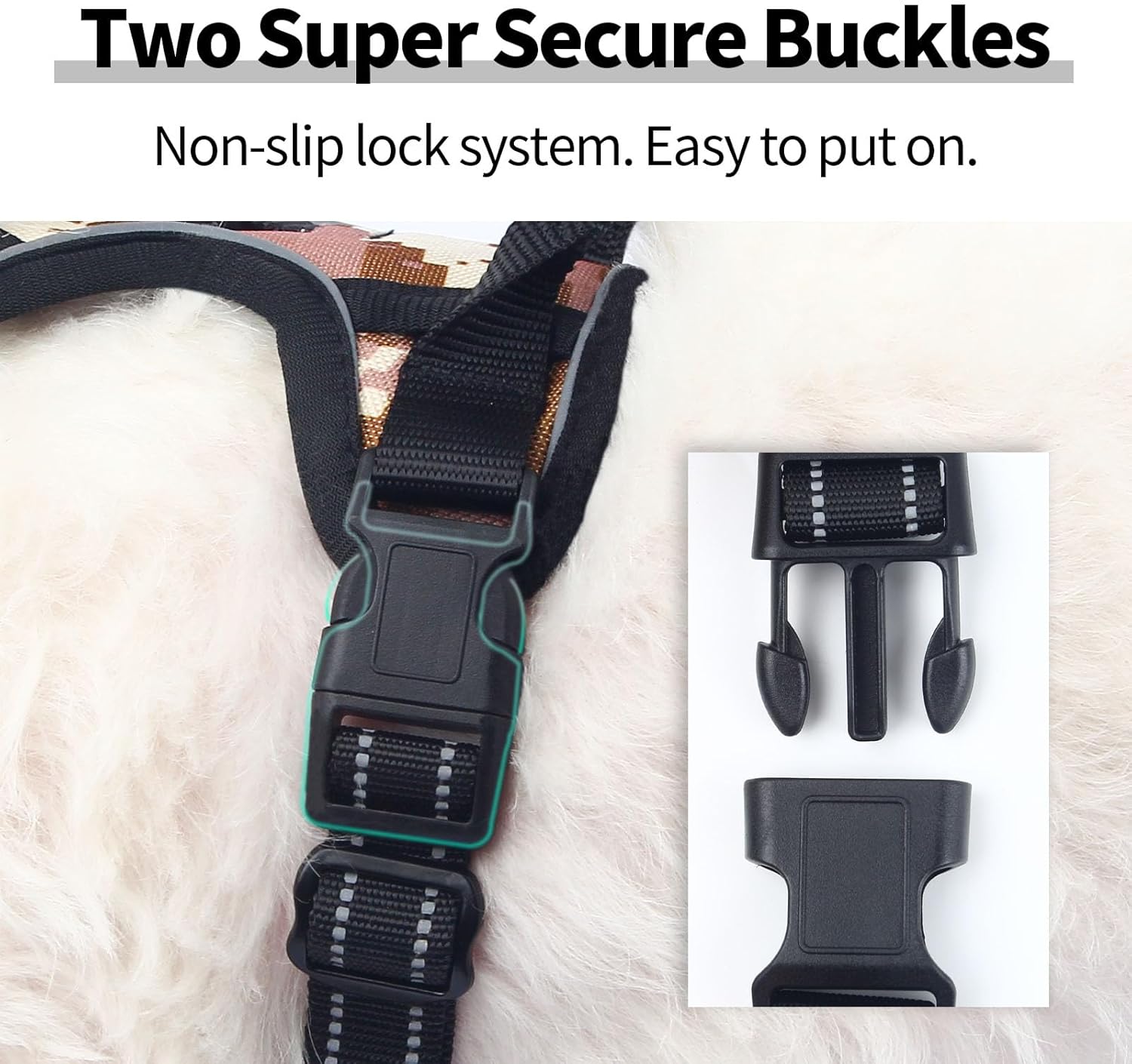 Easy On/Off: Our camo dog harness quick-release chest buckle allows hassle-free wearing. Simply secure the harness around your dog’s back, fasten the buckle, and adjust straps for a snug fit.