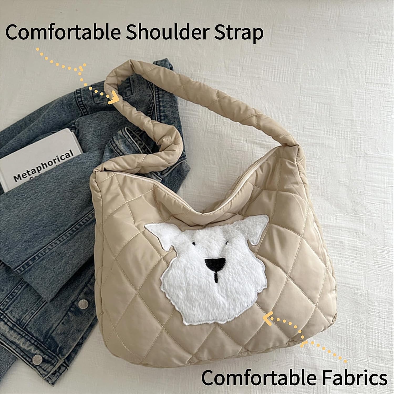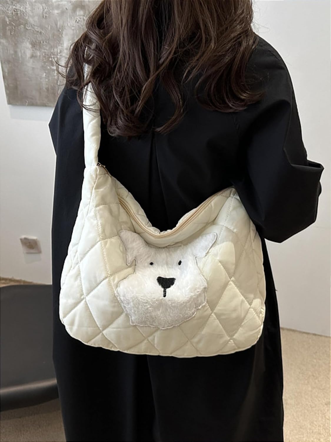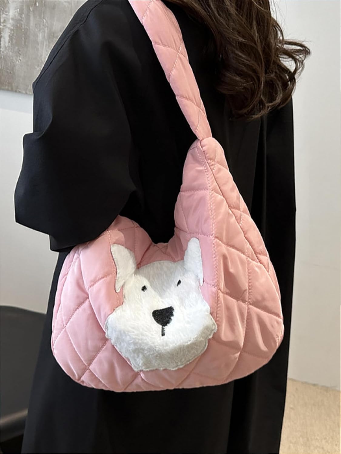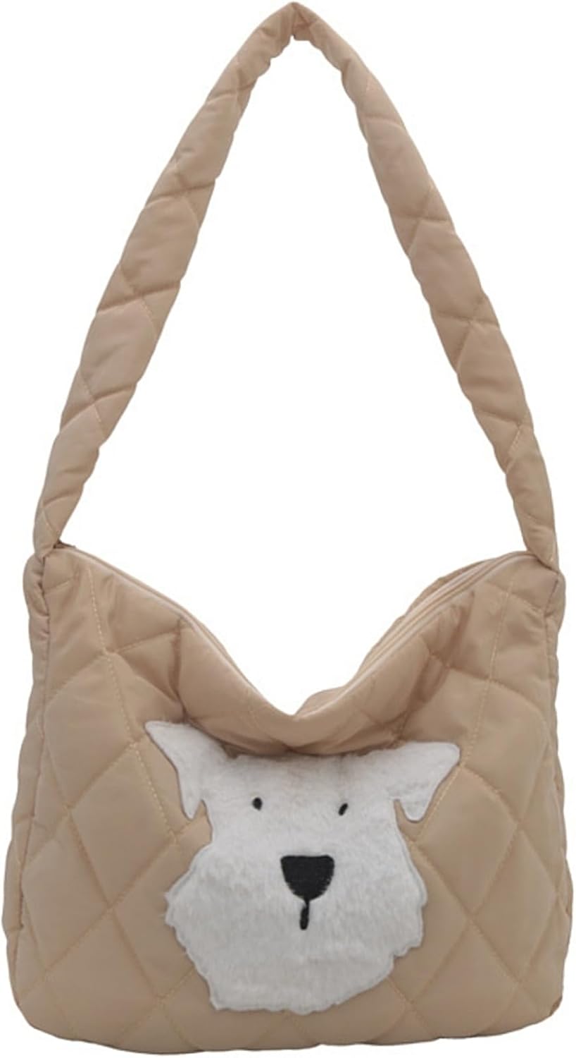 Adorable Dog-Themed Quilted Puffer Tote Bag, Large Versatile Nylon Travel Tote, Crossbody Medium Purse for Women