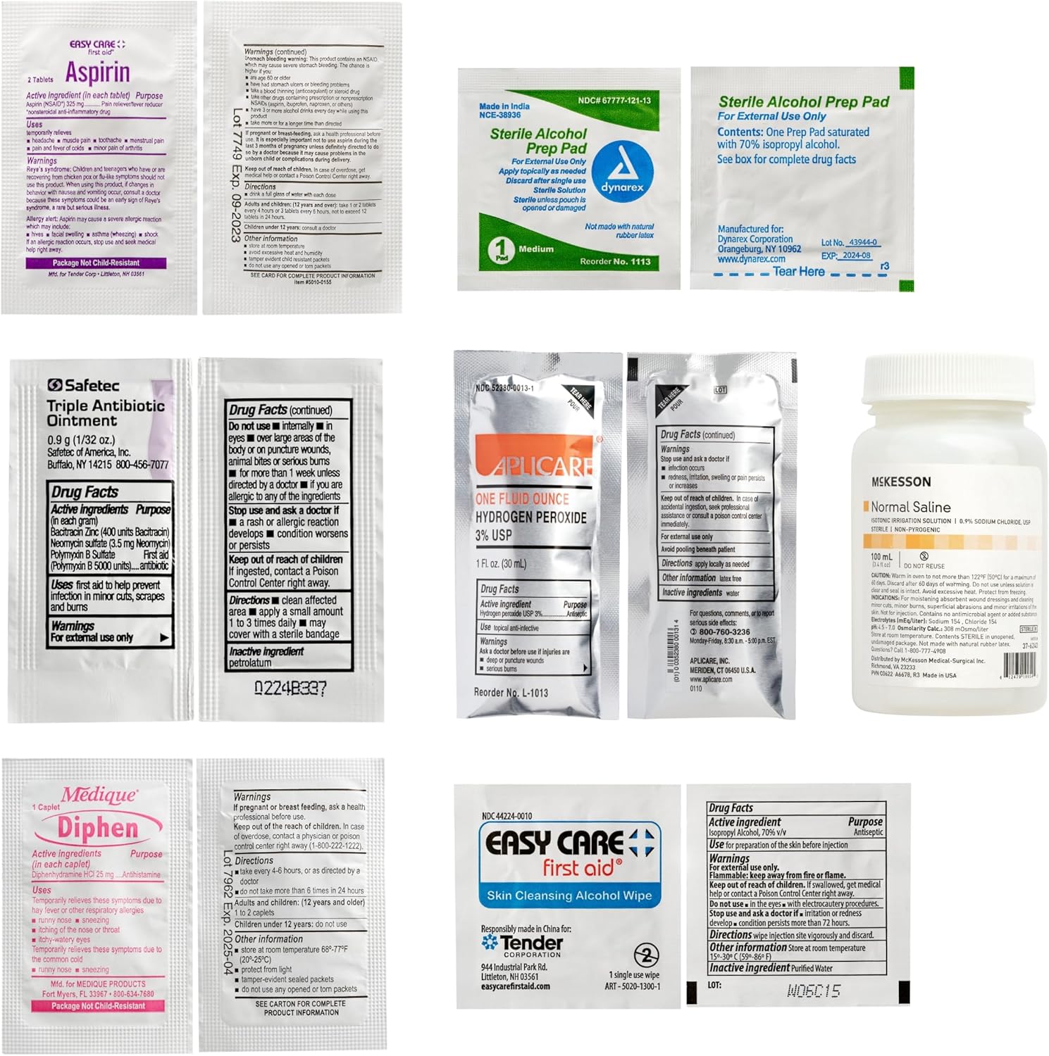 Dog and human supplies for wound care, cuts, and sprains, as well as medications, instruments, and instructions.