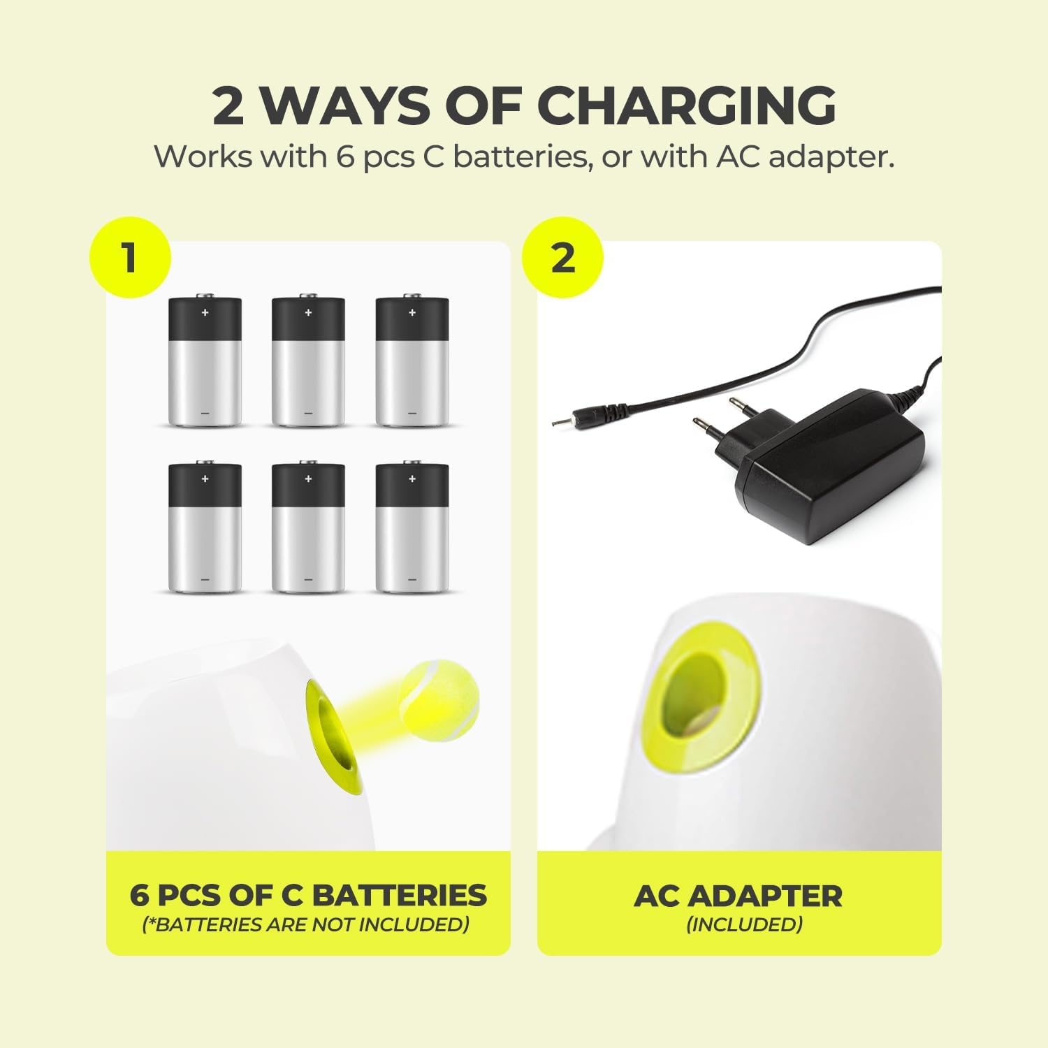 Ball Launcher Includes: Be part of the global trend and treat your furry friend to an unforgettable playtime experience! The package includes three special size tennis balls, ensuring you can start playing fetch with your pet right away. The All For Paws Automatic Ball Launcher can be powered with 6 pcs C batteries (not included) or the included AC adapter for your convenience.