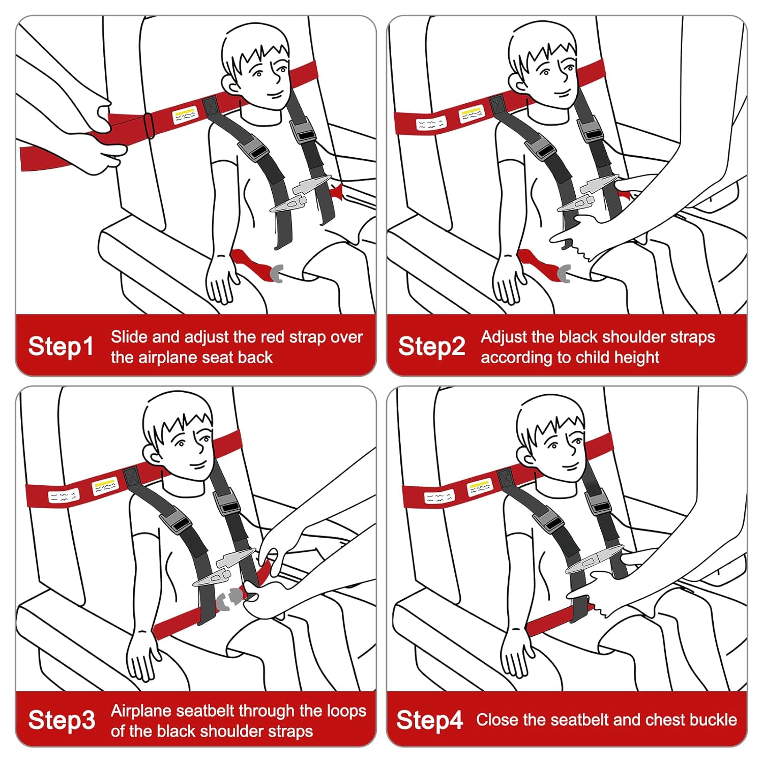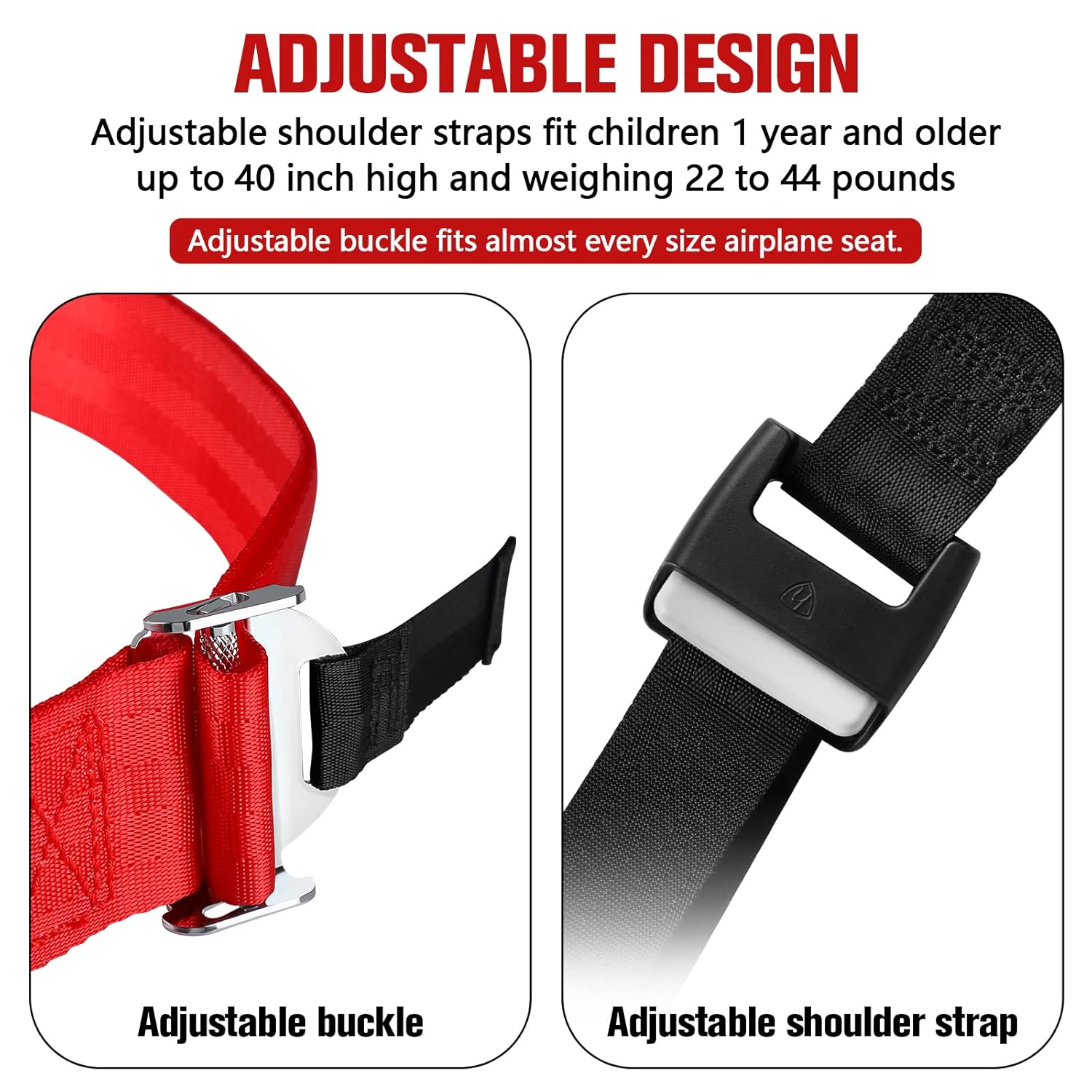 ADJUSTABLE BUCKLE: The buckle of the harness can adjust easily. It can adjust to fit almost every size airplane seat.