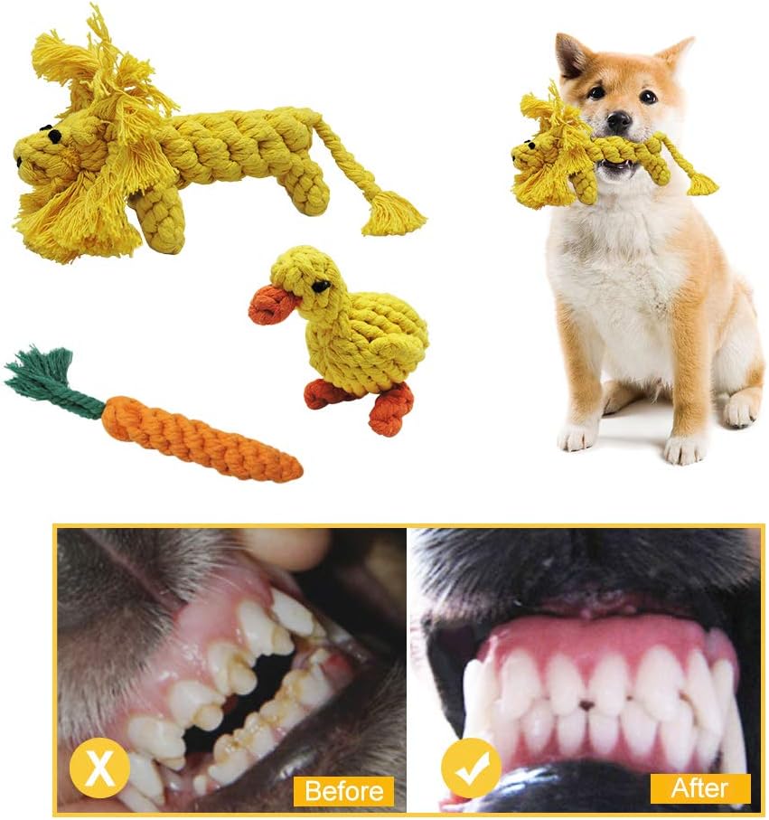 Andiker 3PCS Cotton Rope Puppy Teething & Training Durable Dog Plush Toys – Lion, Carrot & Duck Interactive Biting Rope Dog Chew Toys