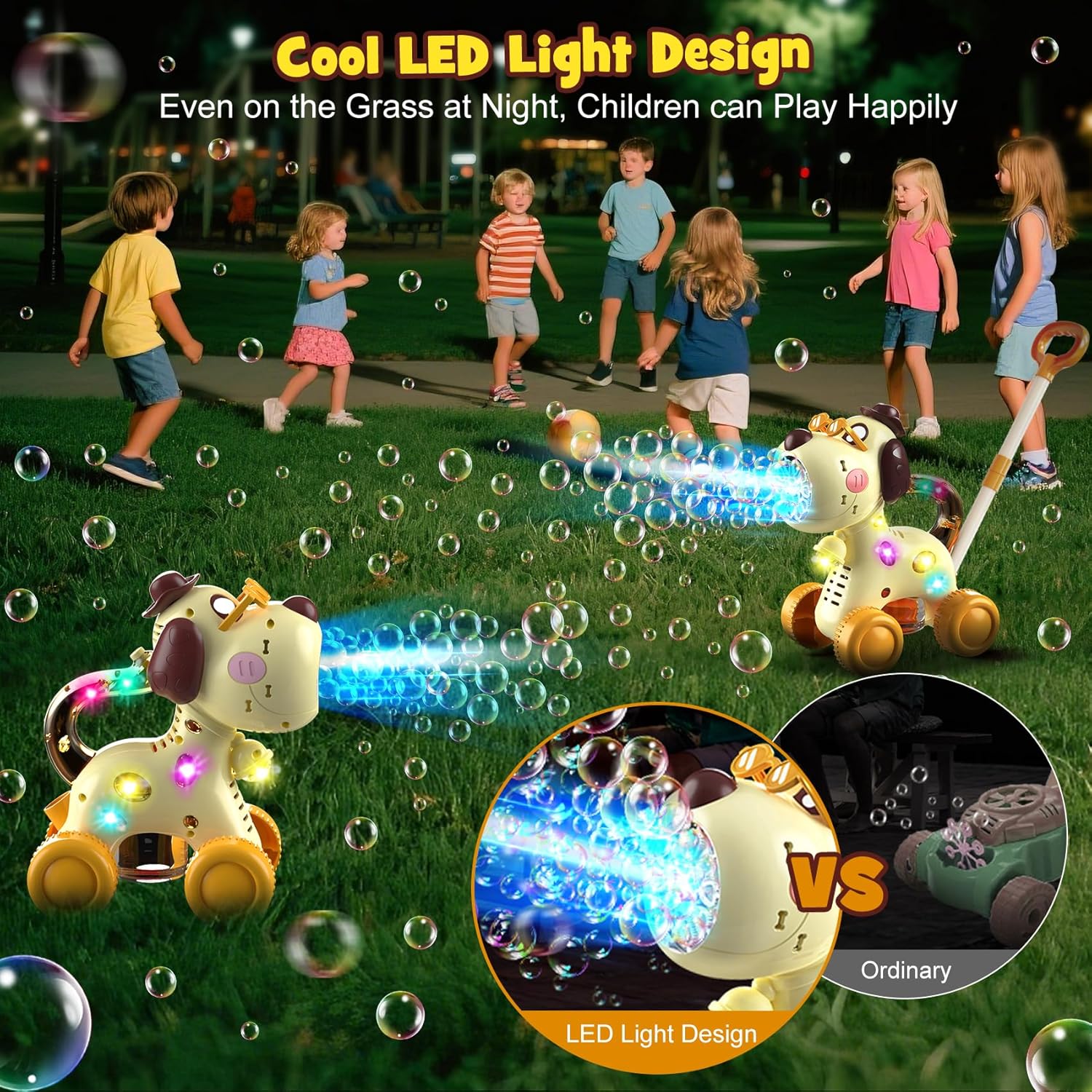 Two Play Modes & Cute Dog Shape: This playful dog bubble machine offers dual modes of fun: ① Push the handle to enjoy a steady stream of bubbles as kids walk, ② Or switch to handheld mode for bubble-filled adventures anywhere. Ideal toddler toys 3-4, it’s perfect for both indoor playtime and outdoor adventures at the park, garden, or beach.