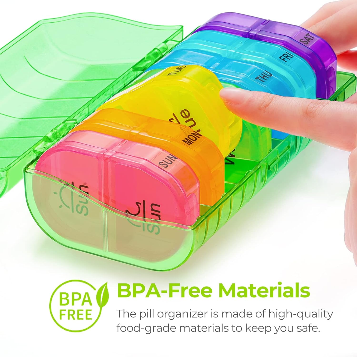 SECURE PILLS FROM SPILLING. No worries about unwanted dumpage of pills found by pets and kids for your slightest unintentional.Outer solid ABS holder and 7 daily food-grade PP pill dispenser cases keep your medicine and supplement safe