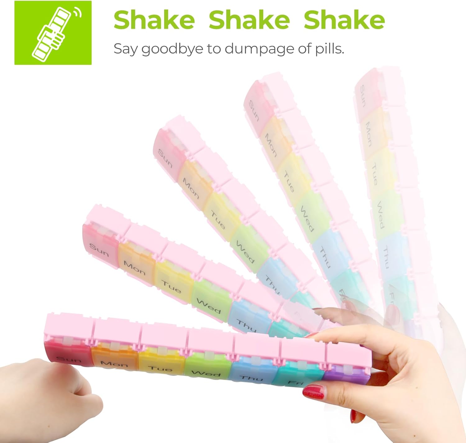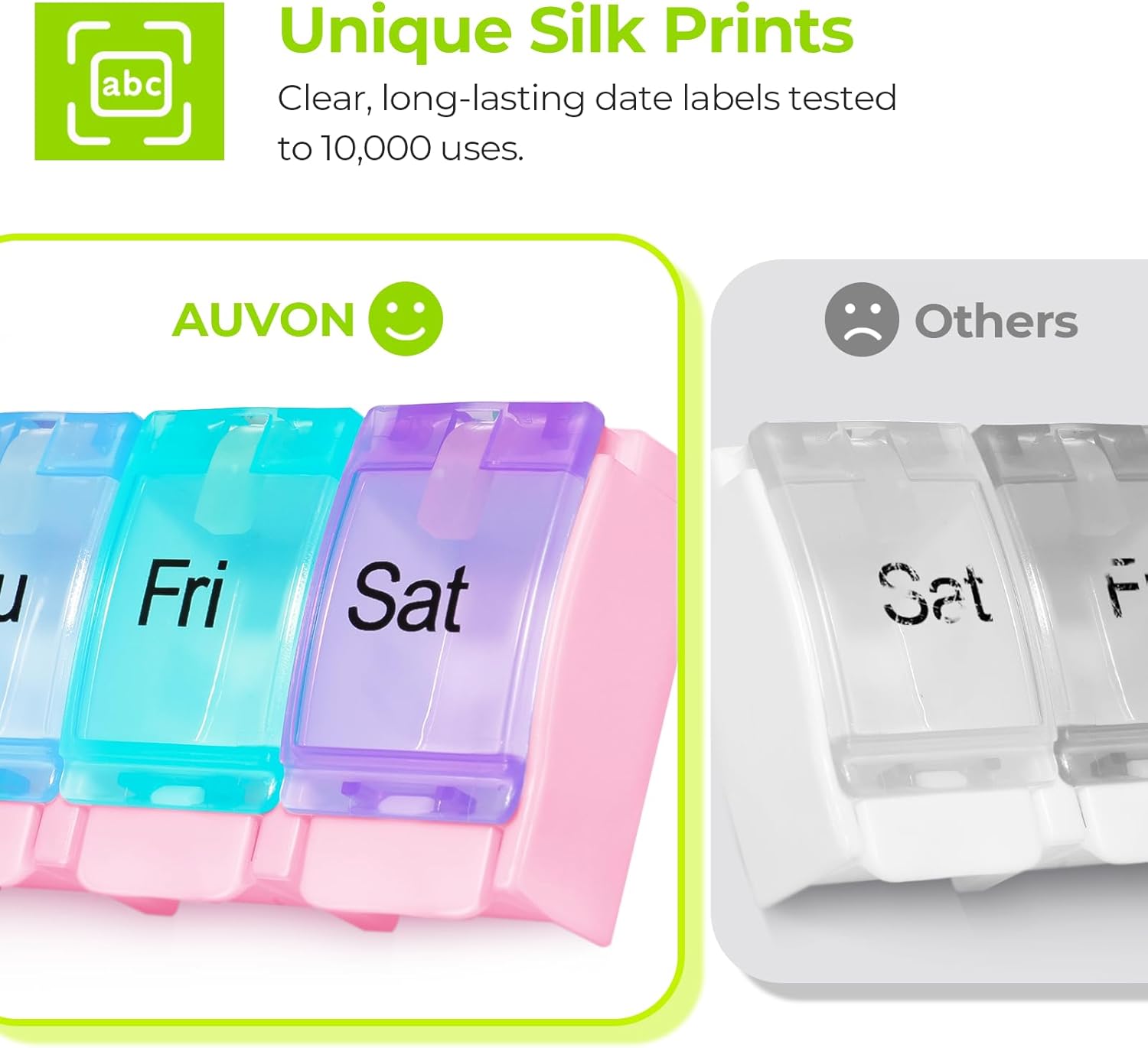 Premium Screen Printing: To avoid screen-printing fonts and icons falling off from the surface of the pill box, we use high-end screen printing ink and strictly do the Ink Adhesion Test with 3M Tapes before shipment. Thus, no need to be frustrated with the missing fonts of “Tuesday” or icons of “PM”, and worry about mistakenly taking the wrong tablets