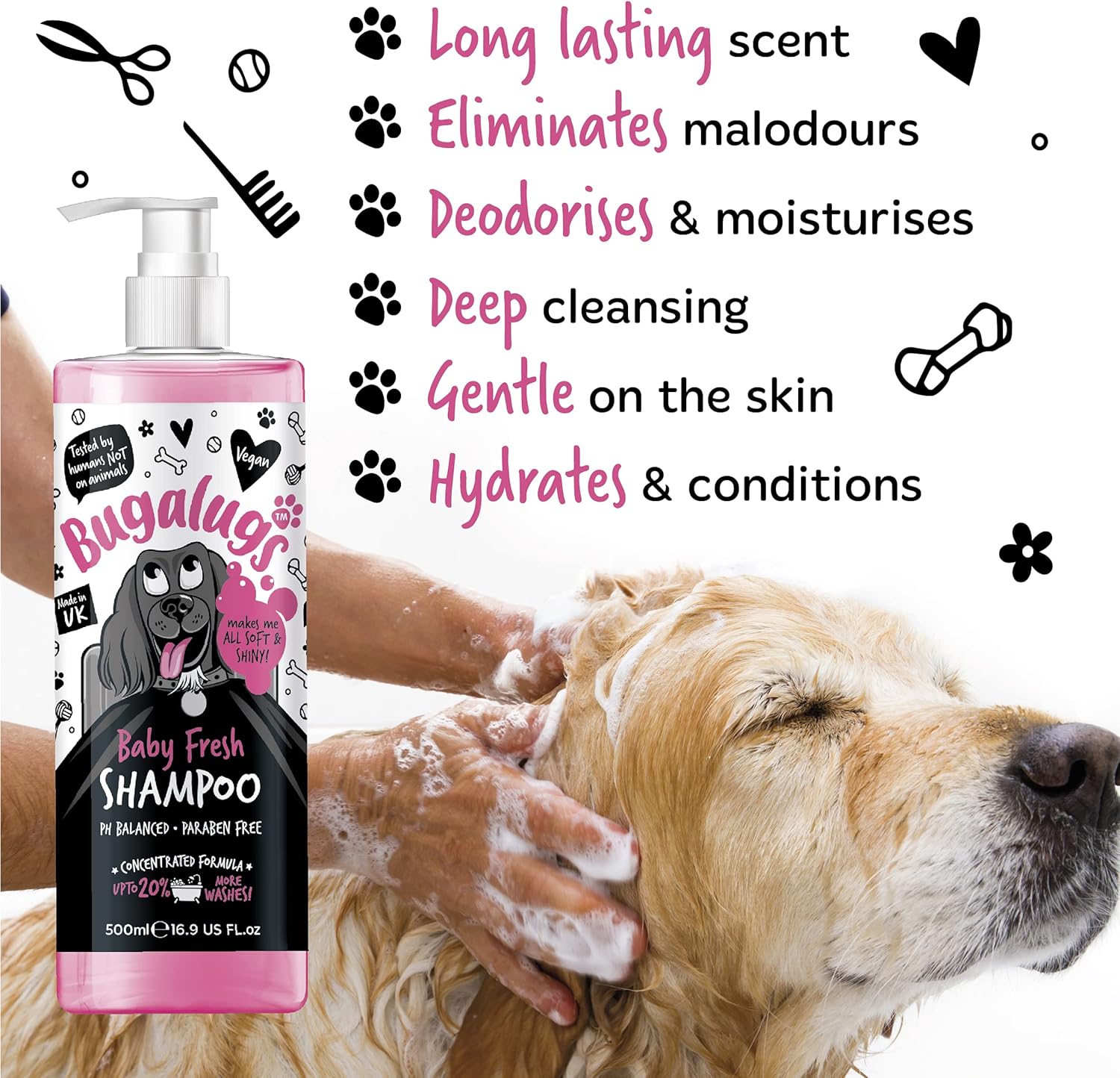 Baby Fresh Shampoo is a gentle cleansing pet shampoo for dogs with the favourite scent of baby powder! It is perfect for removing puppy and doggy odours . Dog wash cleanses deeply yet will not irritate the skin, leaving the coat clean, plush and smelling irresistible! puppy shampoo and conditioner formula is Vegan and helps soothe and nourish the coats sensitives skin. This rich lathering shampoo’s baby powder scent has made this dog grooming products a favourite shampoo in salons and homes all around the world! Suitable for puppies over 8 weeks. Suitable for all coat types. A gentle PH Balanced sensitive shampoo for dogs with a soft baby fresh fragrance shampoo for dogs. Dog grooming shampoo professional is made with water from the Lake District, England and is a great puppy shampoo for sensitive skin. Dogs shampoo removes dirt and grease, leaving the coat feeling soft and shiny with a long lasting baby powder fragrance. Dog shampoo for puppies Can be diluted at ration of 20:1. How to use: Soak the dog’s coat with warm water. Apply dog deodorants shampoo, lather, rinse thoroughly and dry. Avoid contact with eyes – if this occurs rinse with water. Keep out of reach of children. Ingredients:Aqua, Sodium Laureth Sulfate, Glycerin, Cocamidopropyl Betaine, Coco-Glucoside, Parfum, Glyceryl Oleate, Polyglyceryl-2 Caprate, Glycol Distearate, Benzophenone-4, Sodium Hydroxide, Citric Acid, Laureth-4, Alpha Isomethyl Ionone, Citronellol, Cinnamyl Alcohol, Coumarin, Linalool, Lactic Acid, Hydrogenated Palm Glycerides Citrate, Tocopherol, Phenoxyethanol, Sodium Benzoate, CI 17200