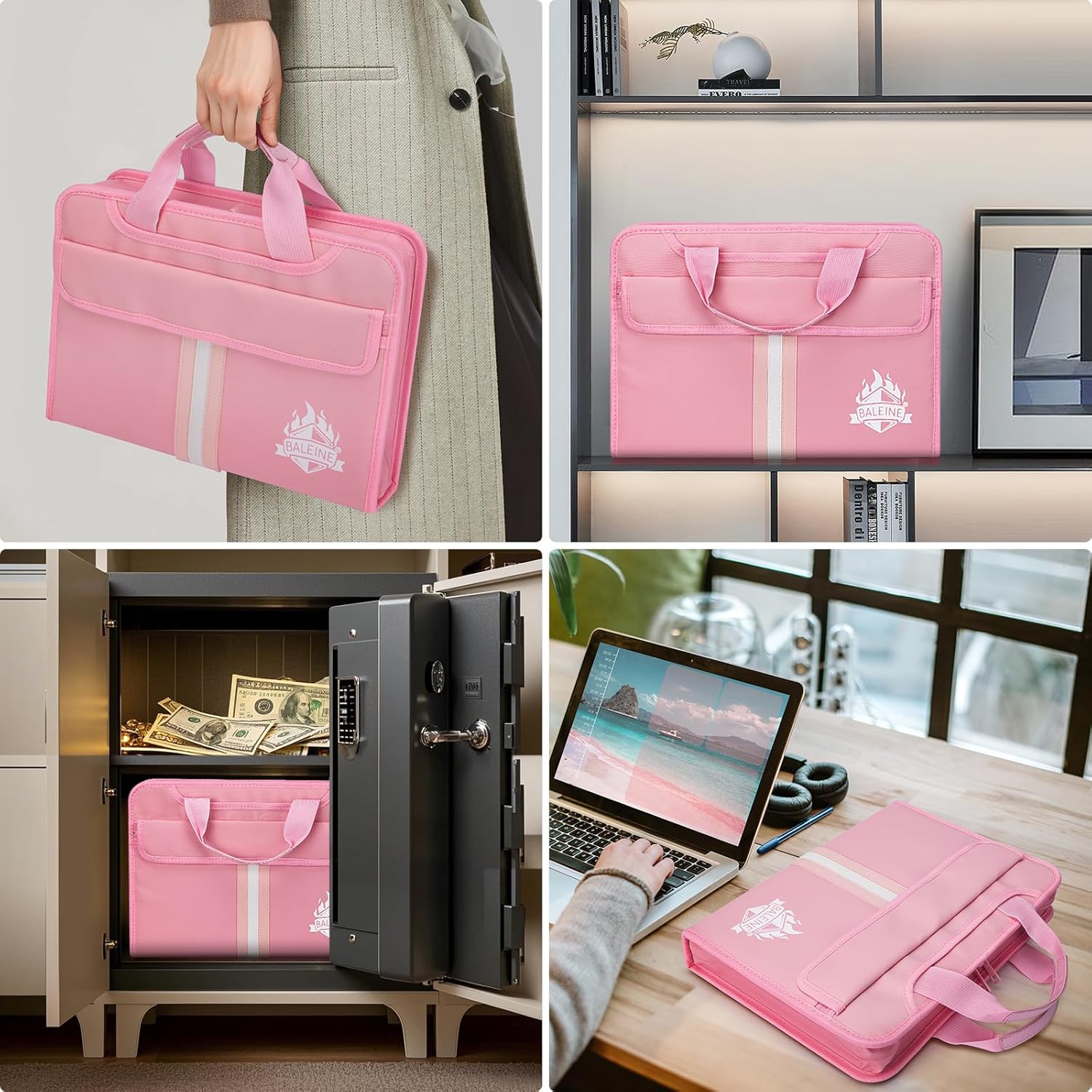 BALEINE Fireproof Document Organizer with Handle, 12 Pockets PVC Accordion File Organizer with Labels, Waterproof Fireproof Document Bag for A4/Letter Files in Travel, Office, Home (Pink)