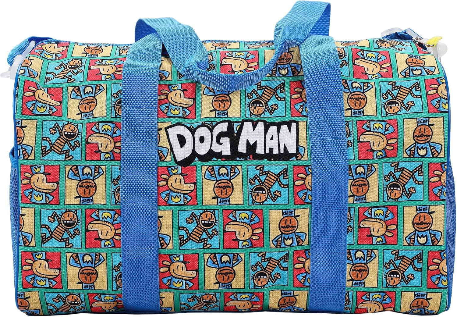 Custom Design: Features iconic images of Dog Man, Petey, and Lil Petey across all items, showcasing fun character artwork for fans. Dimensions: Pilot case – 14″h x 11.75″w x 6″d, Duffle bag – 18″l x 10.5″h x 9.75″d, Utility Case – 6″h x 7.5″w x 2″d and Luggage tag: 4.6″h x 3″w.