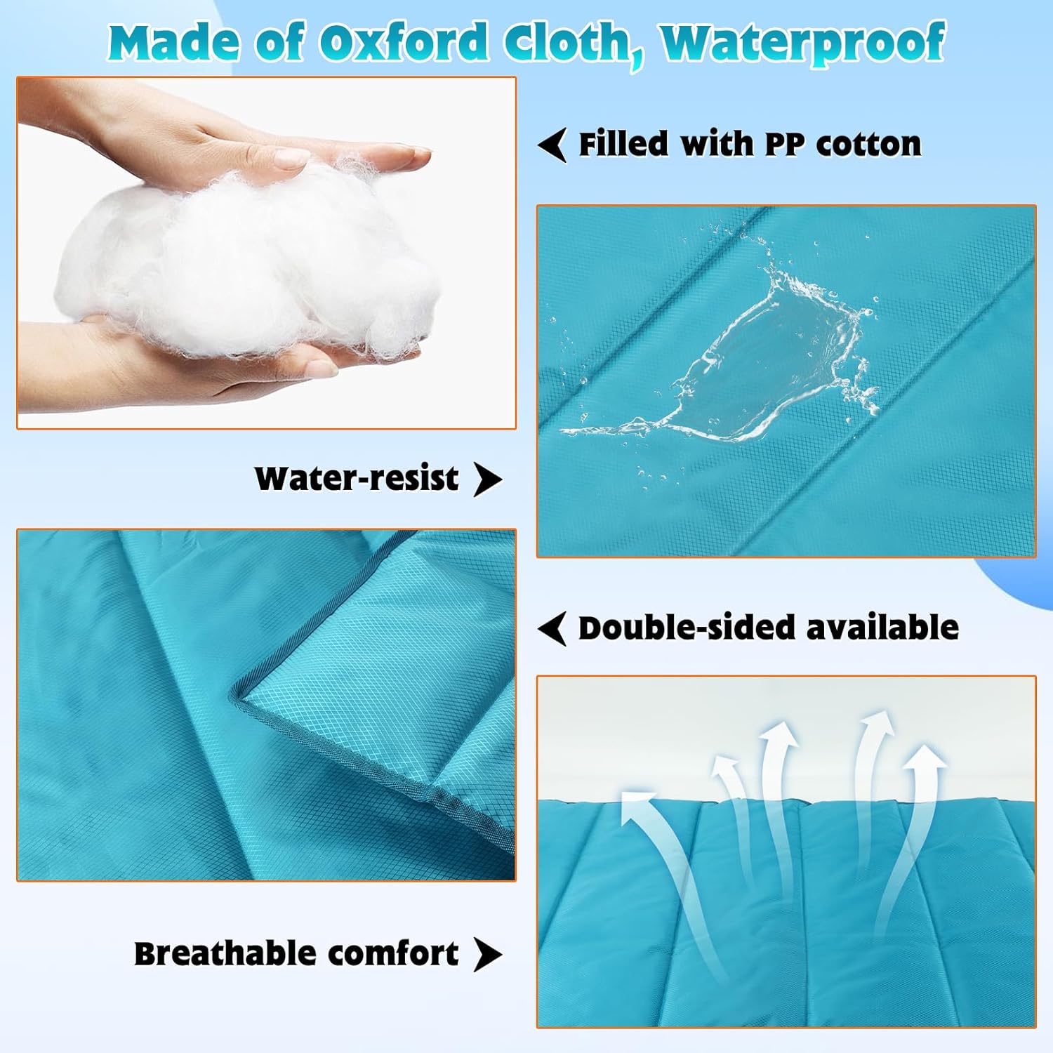 Waterproof Outdoor Dog Mat: Made of high quality waterproof oxford fabric and soft breathable pp cotton,portable dog mat can be used on both sides, waterproof and dirt-proof.Can easily wipe off the surface of the water beads, effectively prevent pet urine, saliva into the wood floor, couch and other furniture. Note: It is not recommended to leave water on the mat for long periods of time.