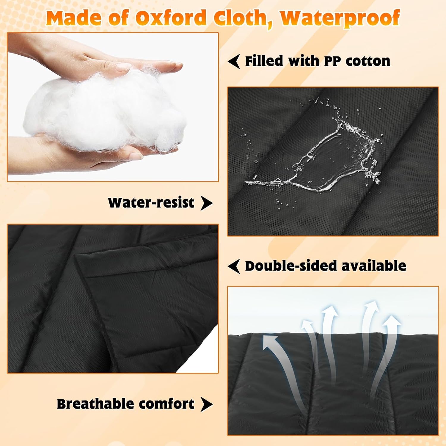 Waterproof Outdoor Dog Mat: Made of high quality waterproof oxford fabric and soft breathable pp cotton,portable dog mat can be used on both sides, waterproof and dirt-proof.Can easily wipe off the surface of the water beads, effectively prevent pet urine, saliva into the wood floor, couch and other furniture. Note: It is not recommended to leave water on the mat for long periods of time.