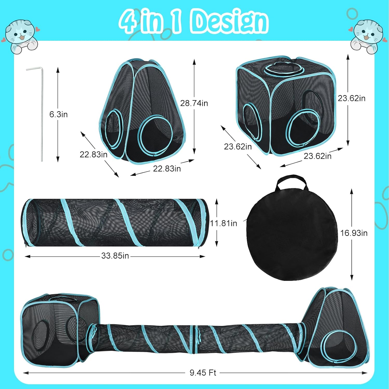 4 in 1 Large Space Outdoor Cat Enclosure: Cat cube tent: 22.83″× 22.83″× 28.74″, outdoor cat tent: 23.62″× 23.62″× 23.62″, outdoor cat tunnel: 33.85″× 11.81″. This cat outside playhouse combines 2 cat tunnel tubes and 2 tents that can accommodate multiple cats, puppies and other small animals to run, chase, sleep and play in the tent.Placing food,toys,and pet mat, in the tent maximizes play time and keeps your furry friend entertained and exercised. Zipper door: 11.81″. Easy access for pets
