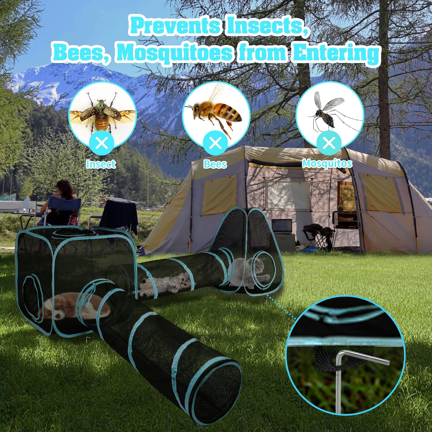 Resistant & High Stability: This cat tents for outside is made of high quality tightly nylon mesh and a flexible polyester spring frame for a strong, sturdy construction and easy cleaning. Equipped with 8 ground nails can easily fix the cat outdoor enclosure on the lawn, improve the stability of the tent. It can withstand intense kitten play and the occasional paw strike