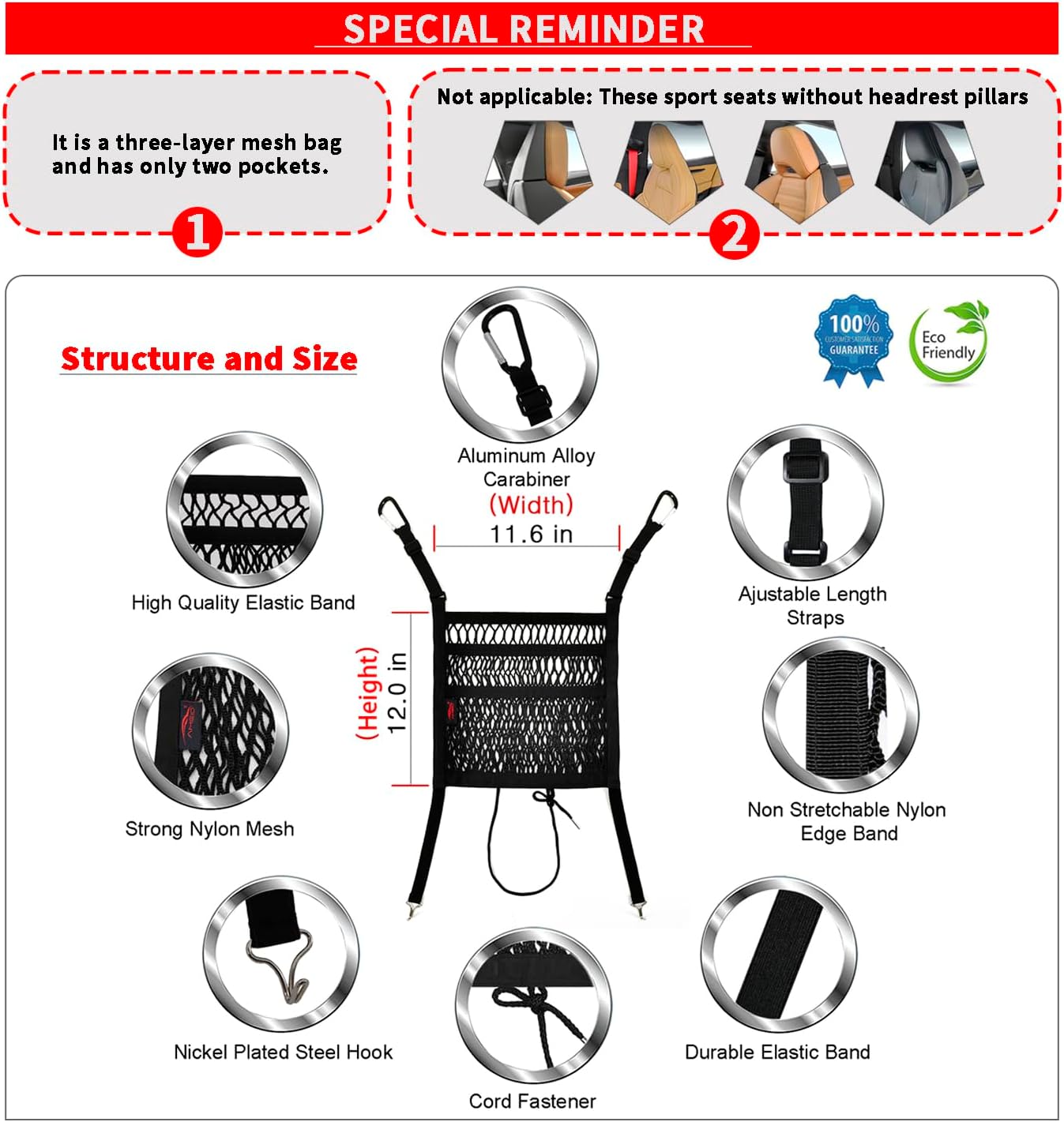 This Car Net Pocket Bag is Made of High-quality Materials: It has 4 metal fasteners, the upper 2 carabiners are aluminum alloy, and the below 2 hooks are nickel plated steel; The Mesh Material of This Car Organizer is Super Strong Performance: High quality nylon, inelastic, the net bed made of it can bear the weight of 6 adults;