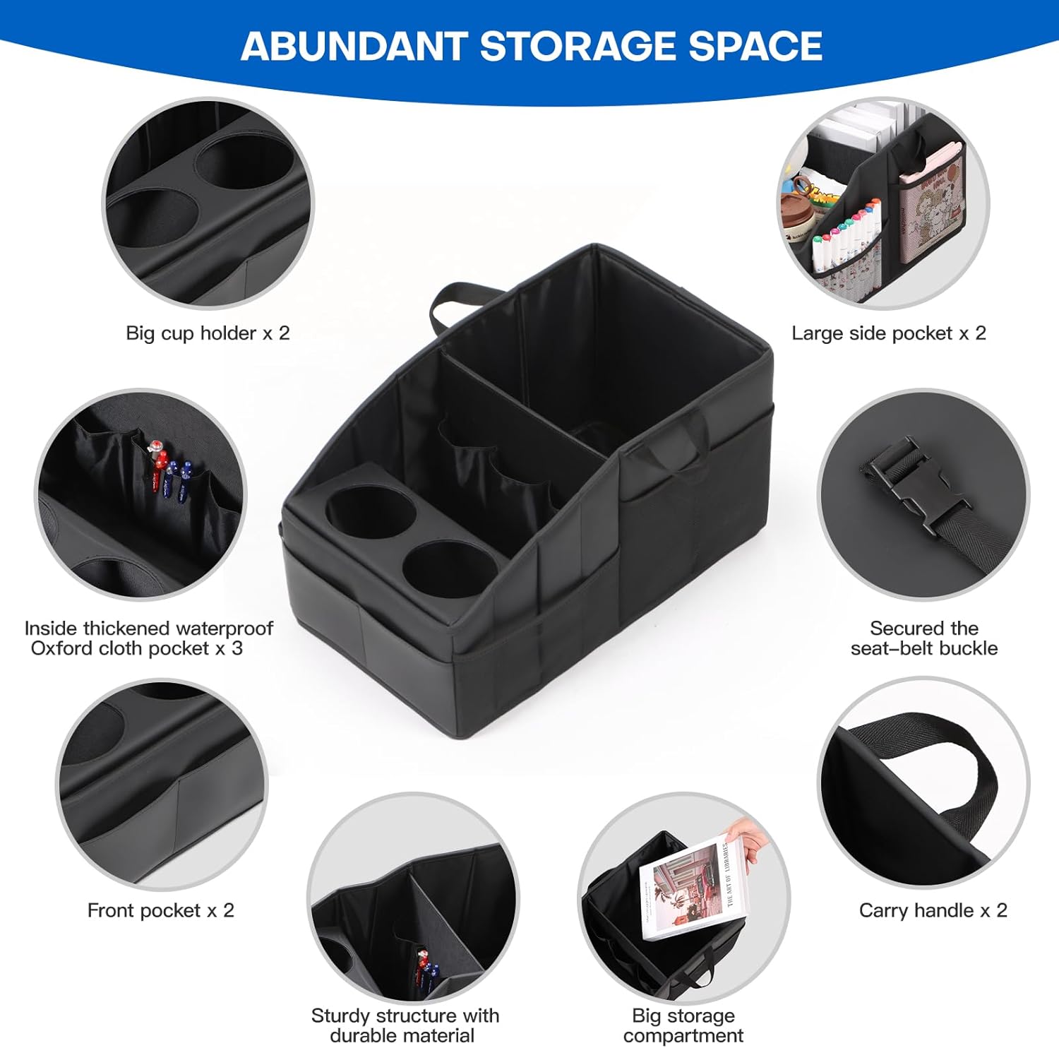 【More Storage Space】The back seat car organizer has 2 spacious main bag areas, 3 internal pockets, 2 built-in cup holders(collapsible), 4 oversized side pockets and 2 front pockets to keep any car console or car seat organized. can be used for organizing and storing water bottles,games, blanket,travel diaper bag, or anything they may need during drives. Suitable for any type of vehicle’s front seat, passenger seat, back seat, floor and trunk, like Car / Truck / SUV / Minivan / Van. Widely used in traveling, car activities, car storage, home storage, or used as an office desk tidy organizer.