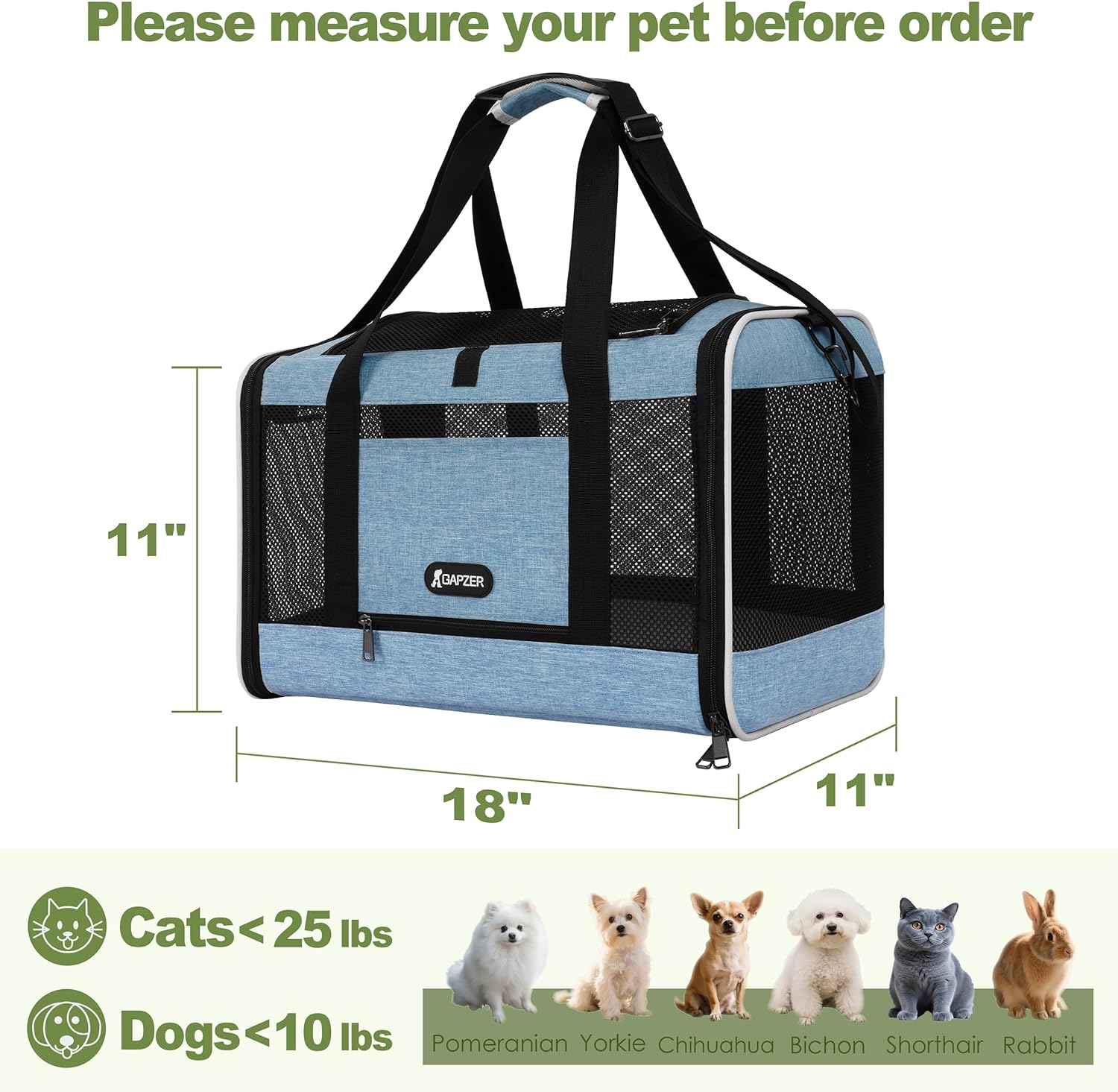 Spacious Soft-Sided Pet Carrier – 18x11x11 inch crate comfortably fits medium size pets, such as cats weighing 15-25 lbs or 10 pounds small dogs like Yorkies & Shih Tzus with room to stretch