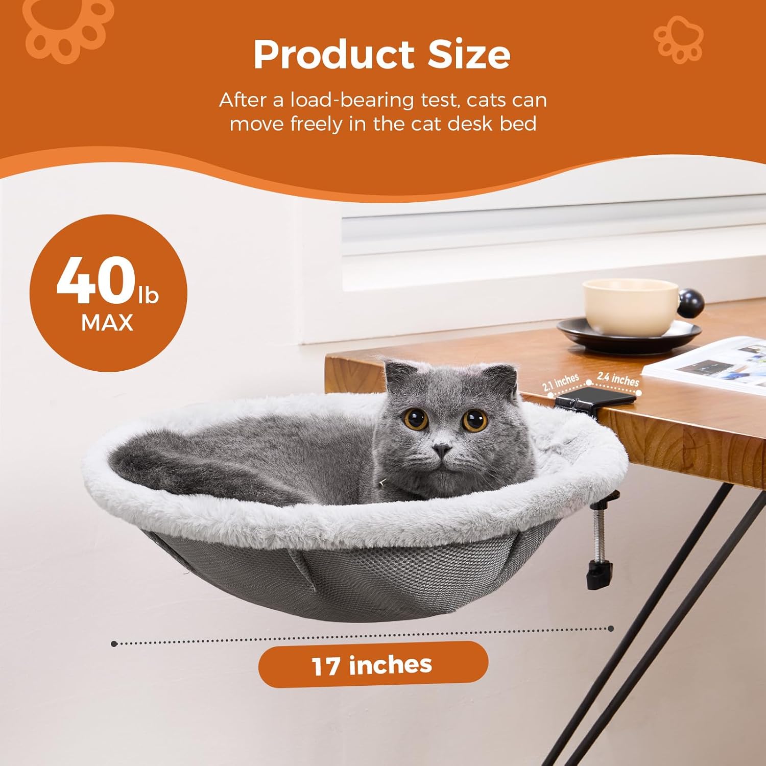 After-Sales Support: Before purchasing, please note that the cat bed is compatible with straight-sided desks up to 4.8 inches thick and has a maximum weight capacity of 40 lbs. If you encounter any issues, simply reach out to us. We offer a 6-month warranty with free replacement parts or a new product, giving you peace of mind.