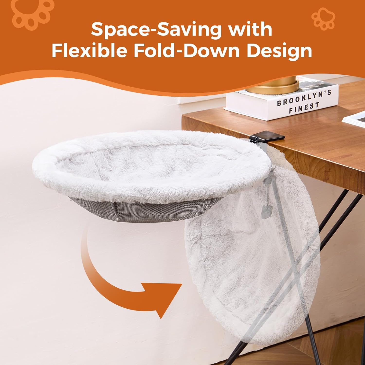 Easy-Clean & Space-Saving: The removable zippered cover is machine washable for effortless maintenance, ensuring a hygienic and cozy space for your cat. When unused, simply press the buckle to fold the cat bed swings down 90° —no disassembly needed to maximize space. Sponge-padded clamps prevent desk scratches while securing the bed.