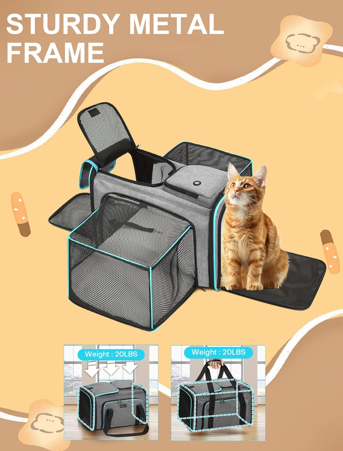 Afety First, Adventure Always:Made with non-toxic, scratch-resistant polyester and reinforced stainless-steel rods (holds 50+ lbs!), this carrier stays sturdy even when expanded. Double-lock zippers + mesh top window keep pets secure while letting you check on them mid-trip. Perfect for anxious or curious pets!