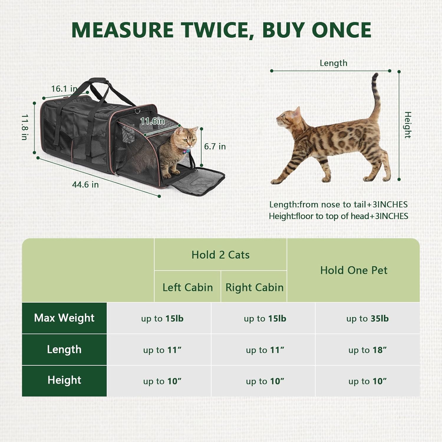 Large cat carrier with litter boxes for 2 cats: Two large, expandable compartments on the left and right allow your pets to easily turn around and stretch. Due to the sufficient space, your two cats can lie down comfortably during long journeys. Recommended each cabin for pets up to 15lbs