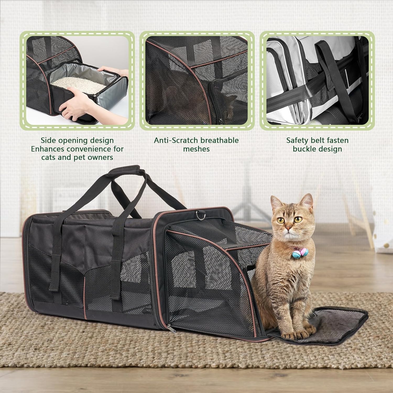 Cat Travel Carrier with Litter Boxes for 2 Cats, Double-Compartment Soft Pet Carrier, Expandable Portable Cat Carrier for Car Travel, up to 35 lb Road Trip, Camping, Hiking, Black