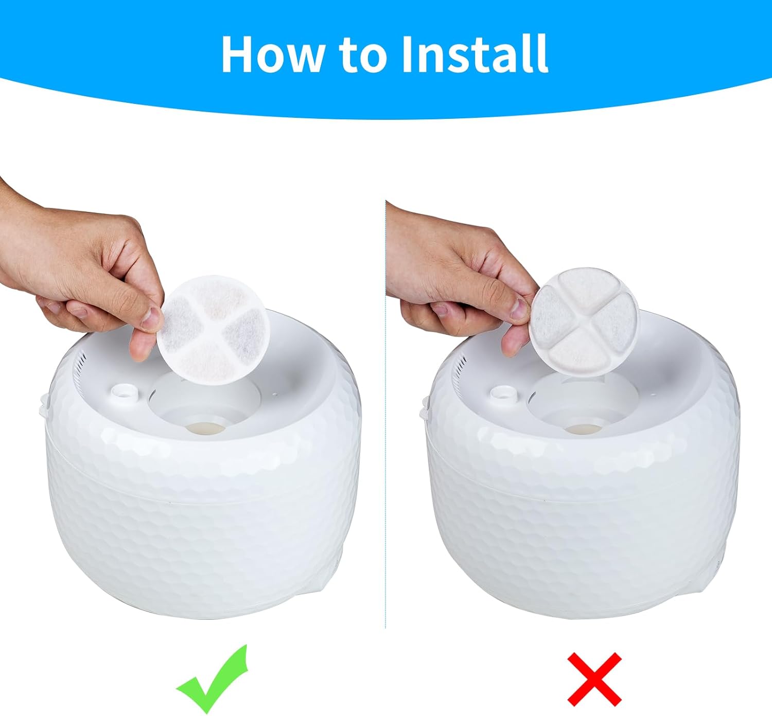 Note: Rinse fiter with water before use. Replace fiter every 2-3 weeks. After replacing the fountain filter cotton, press and hold the indicator light for 5 seconds to turn it off.
