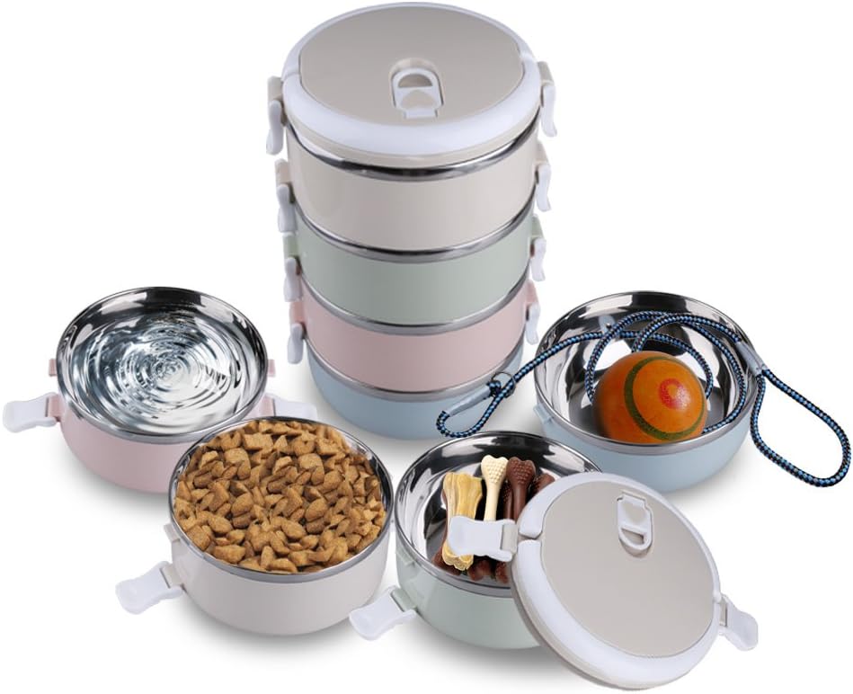 Compact 4 tiers design, you can use it storage more food. Specially designed for pet in travel. Leak proof lid with rubber seal for the transport of water