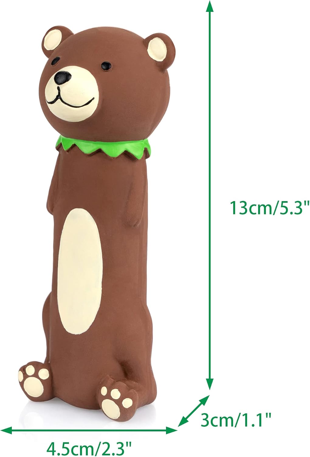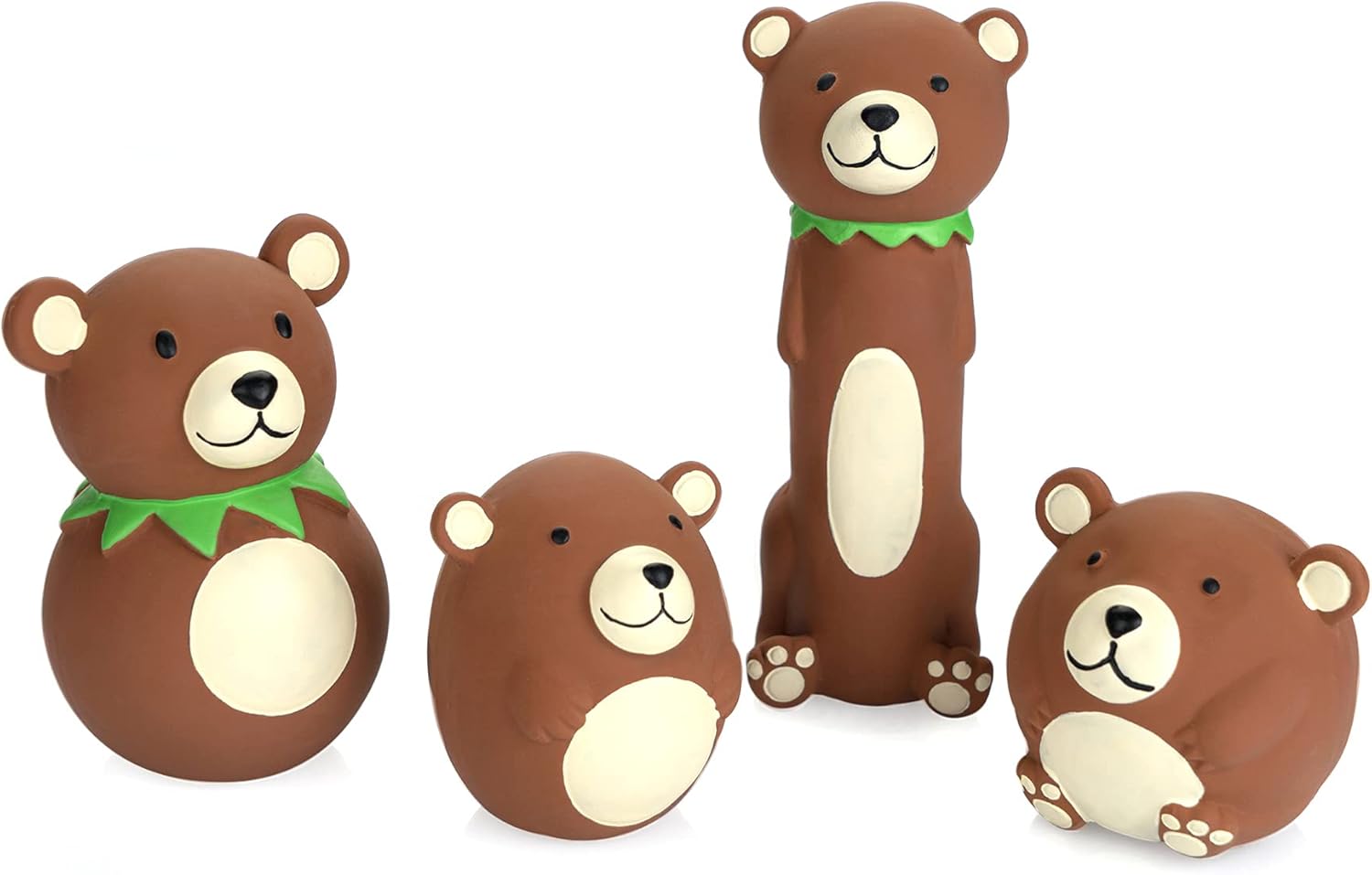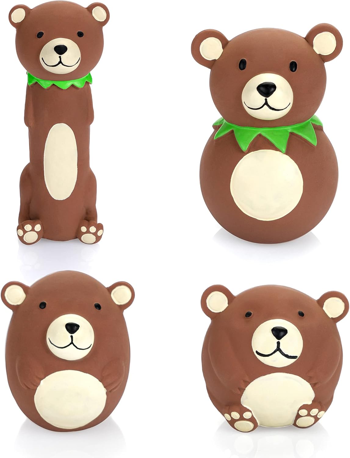 Chiwava toys are made from Latex,NON-TOXIC. No Stuffing. Toys coating is pleasant to the touch and soft, easy to clean. Toys come in set of 4 brown bear with funny different shaped (Long Stick Bear,Egg Shaped Bear,Bowling Ball Shaped Bear & Round Bear). have small squeaker which makes squeak sound when you squeeze it. Great for Fetch,Throw,Tug and Interactive Toy.