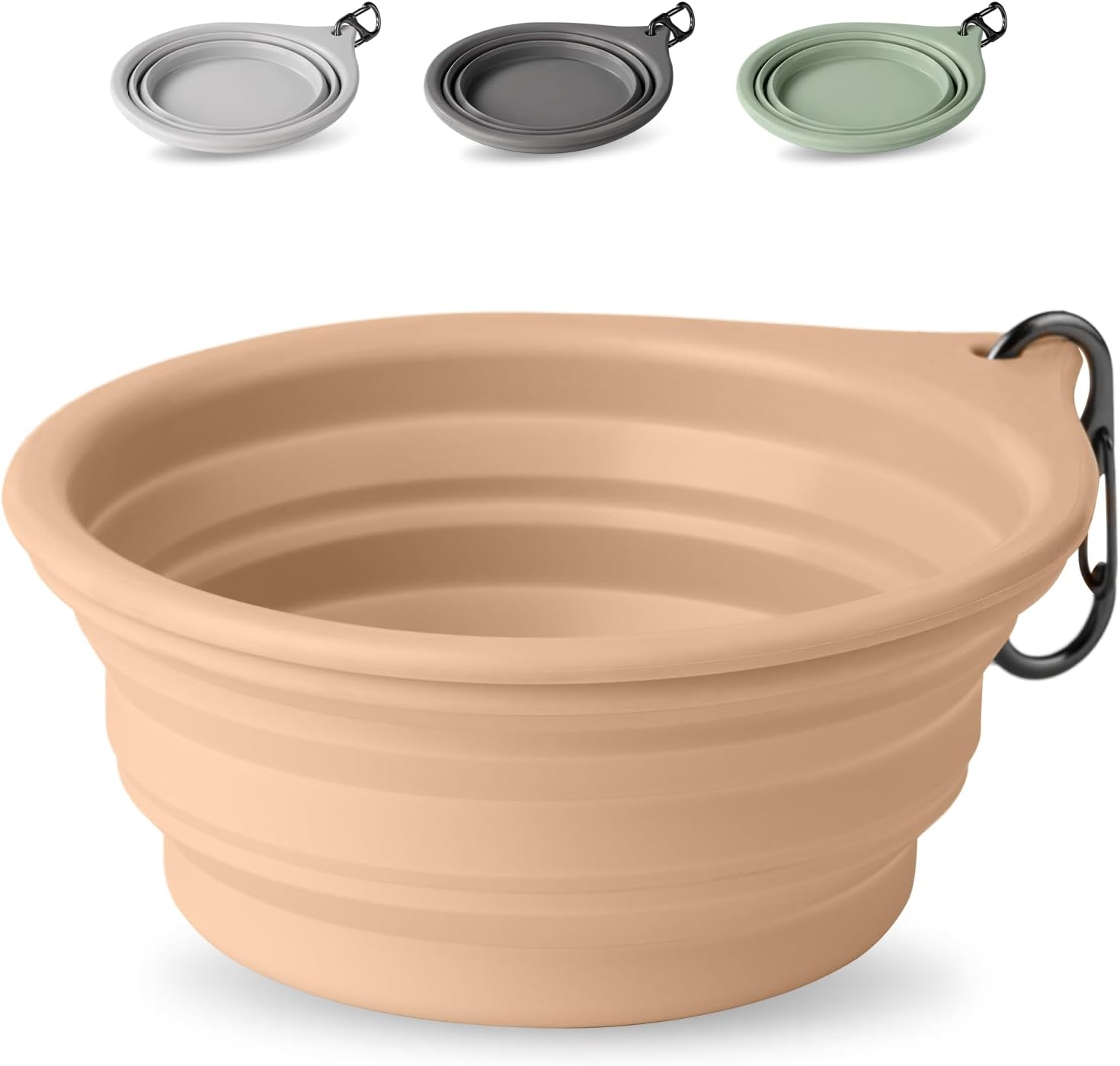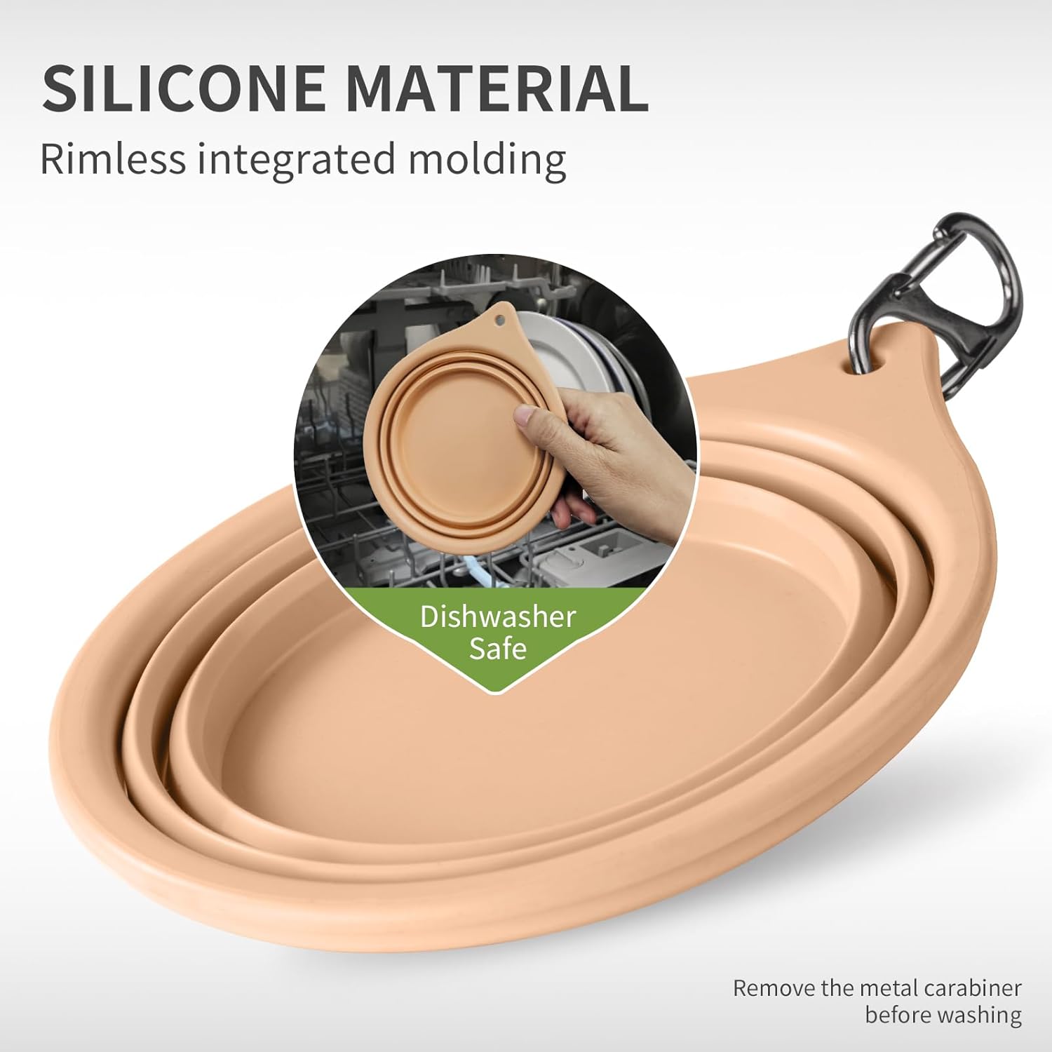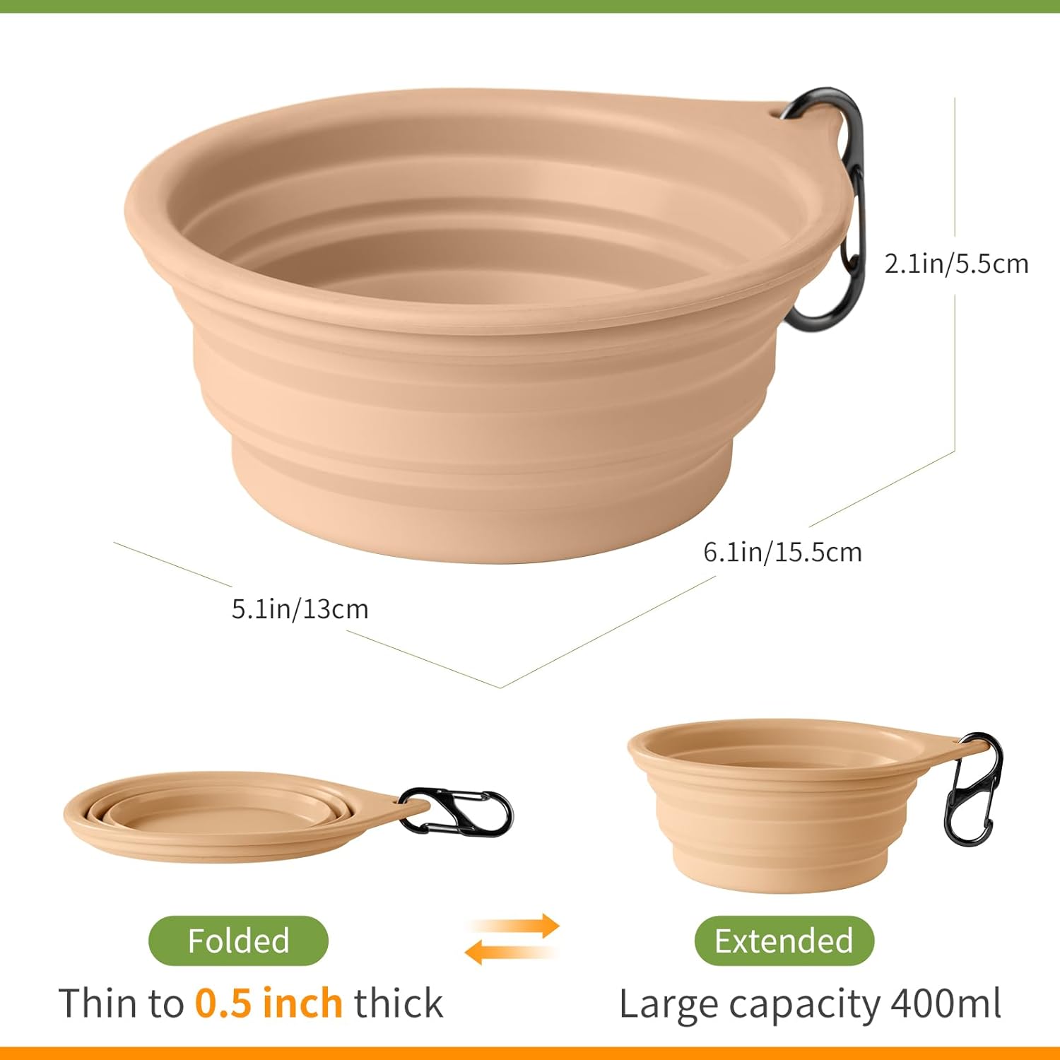 Collapsible Dog Travel Bowls (13oz/350ml), 100% Food Grade Silicone Integrated Molding, No Plastic Rim, Portable Pet Feeding Watering Dishes for Outdoors with Clasp, BPA Free (Khaki)