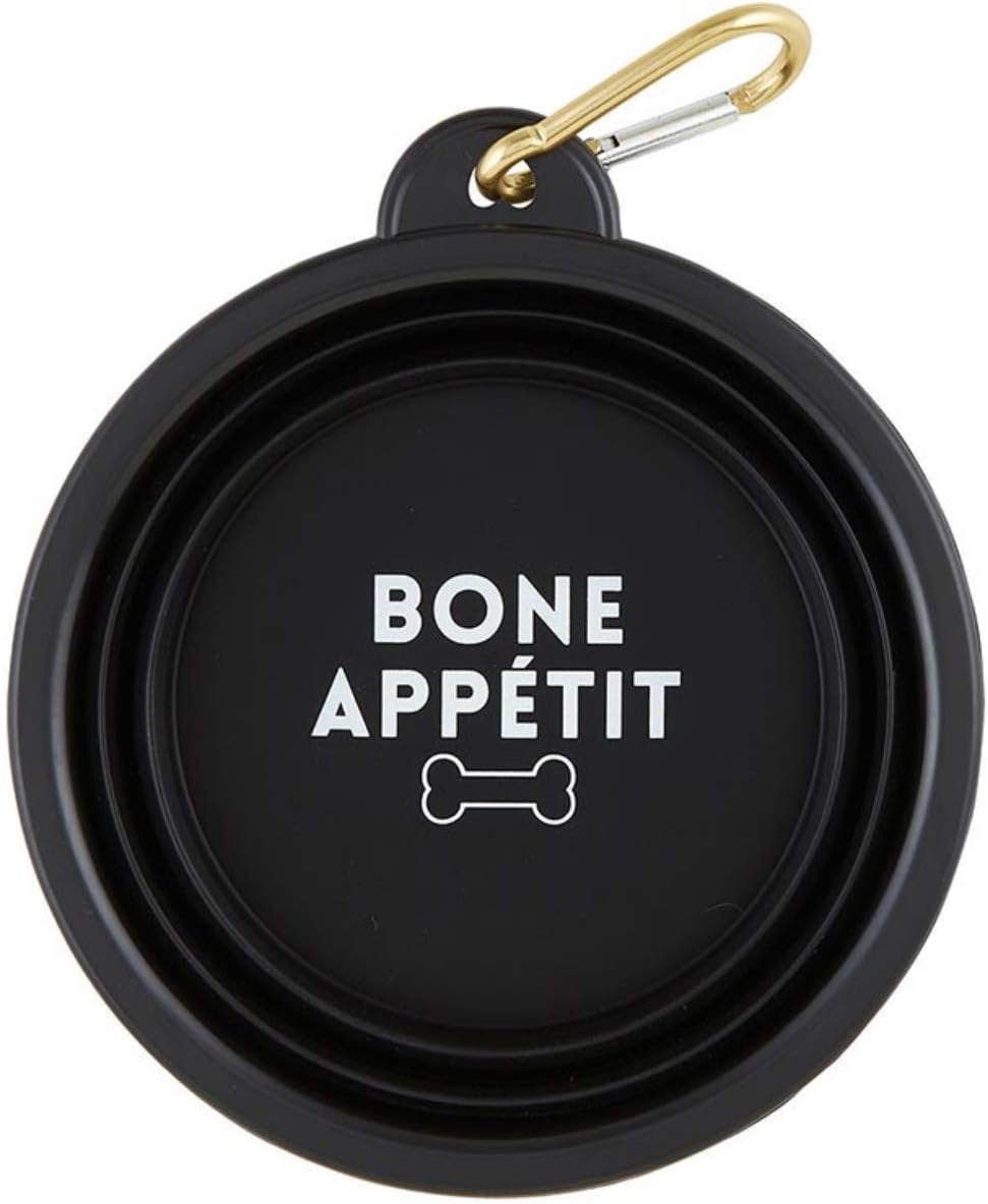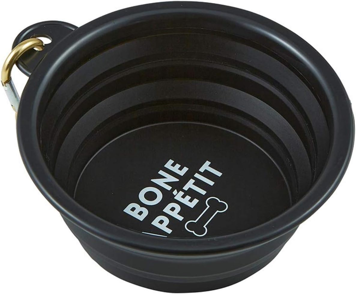 BLACK AND WHITE: Collapsible black pet bowl with white letters and a bone design which reads, “BONE APPETIT”