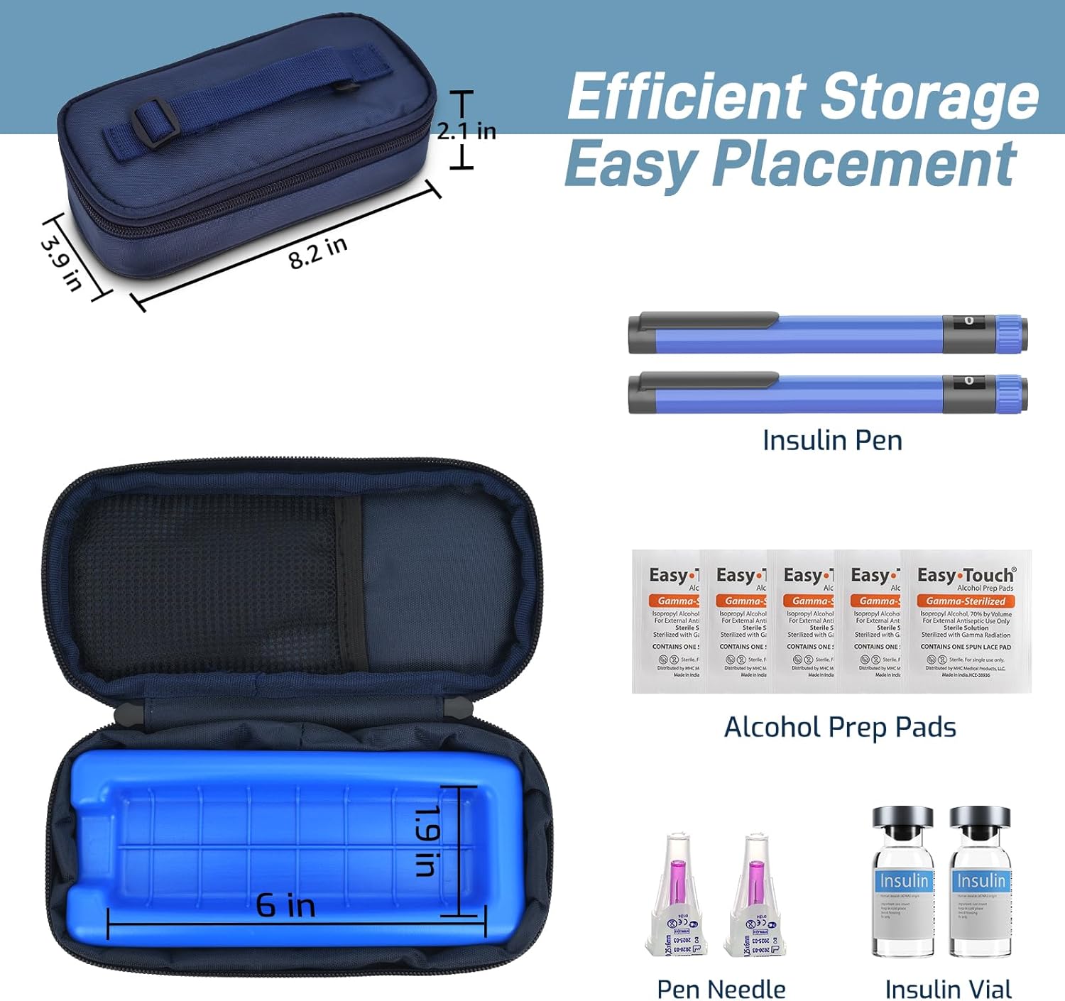 👍Good Storage: The ice brick can accommodate 2 insulin pens or 1 pen and 2 insulin bottles. The mesh pocket can store alcohol wipes or a thermometer, tailored to your insulin injection requirements.