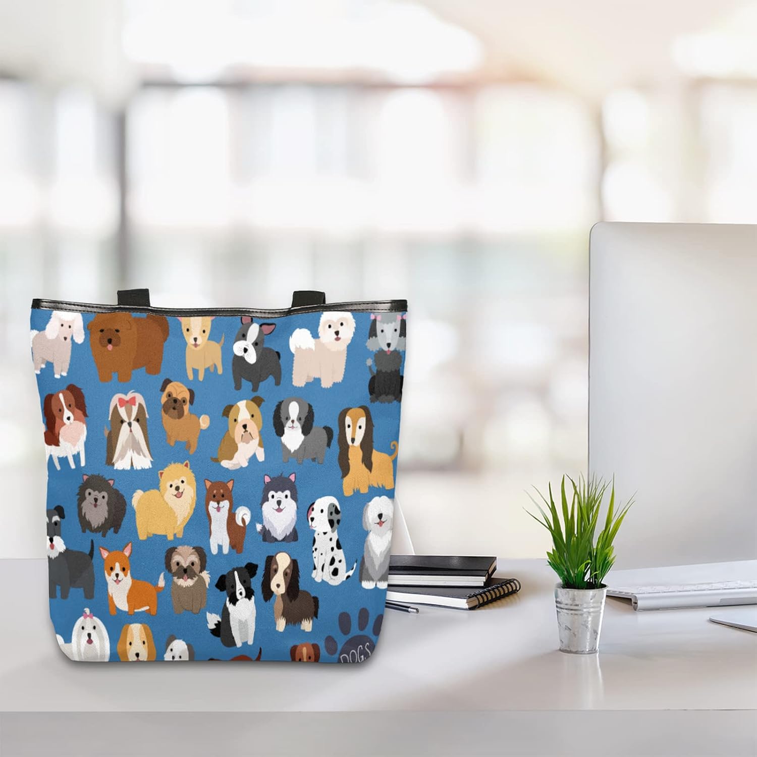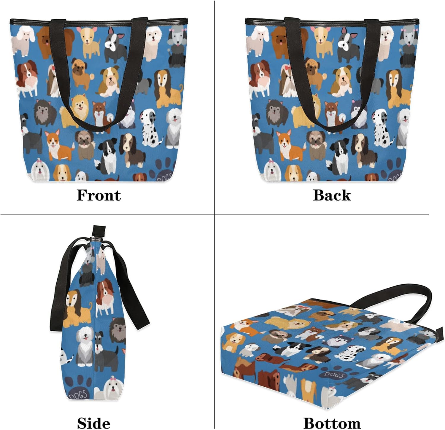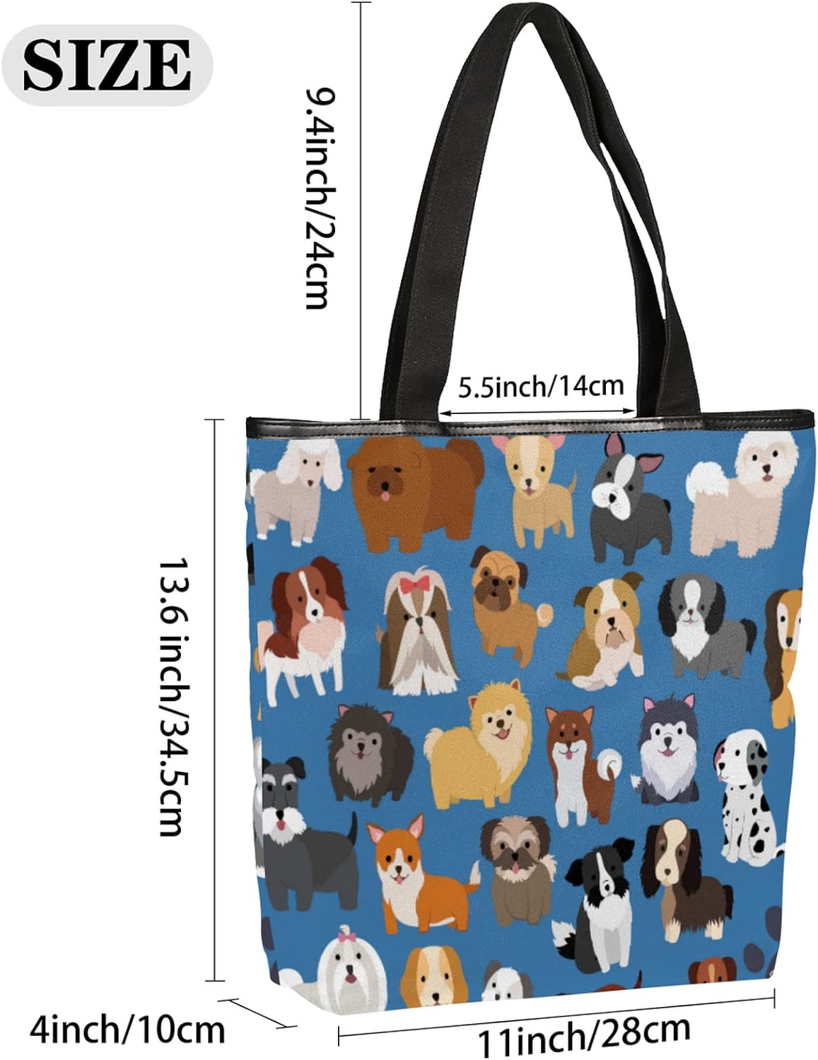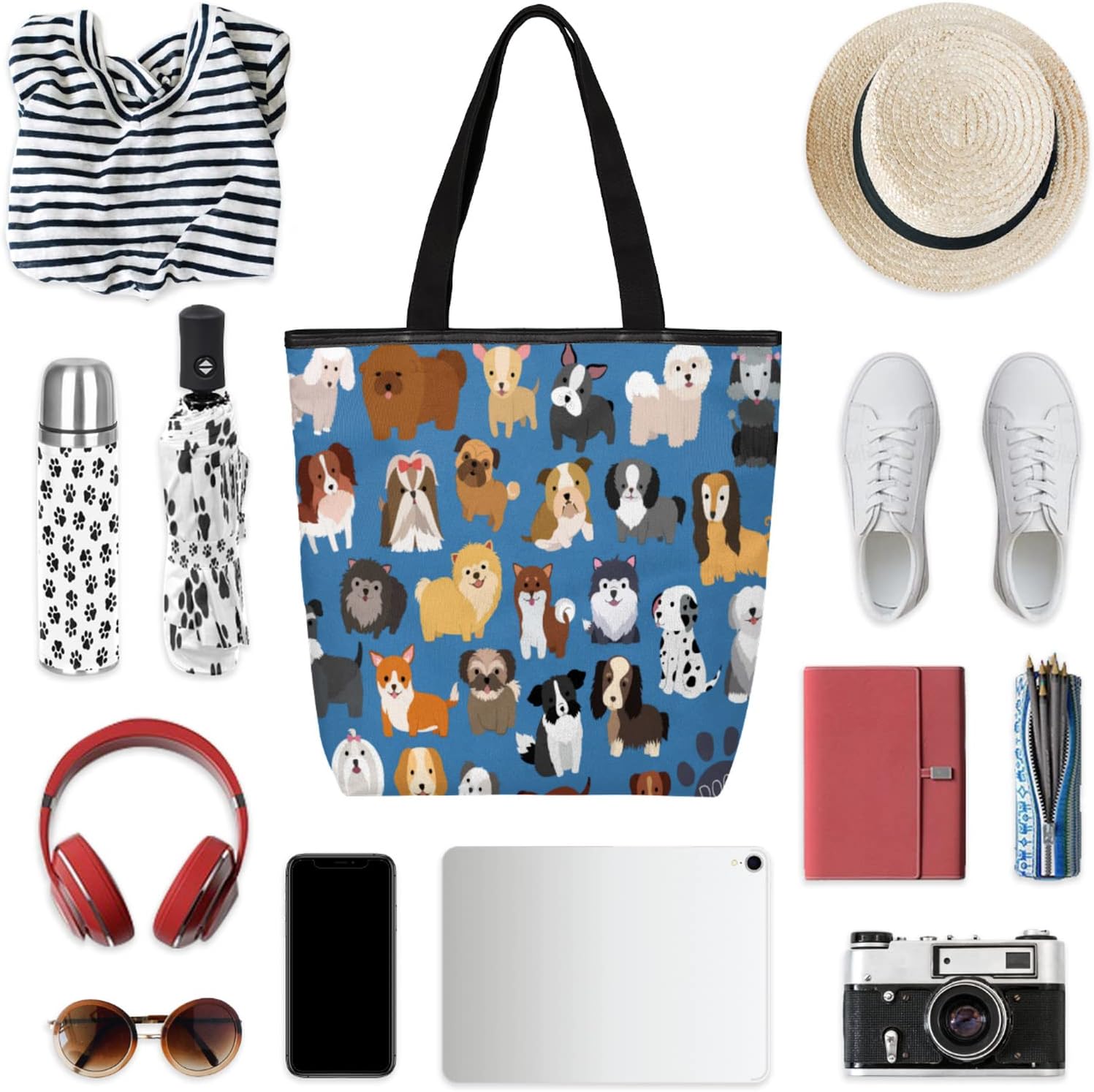 Cute Dog Pattern Canvas Tote Bag, Eco Friendly Reusable Grocery & Beach Bag With Zipper Inner Pocket for Women & Girls
