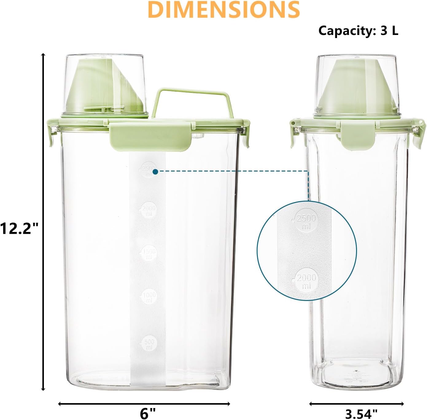 Coming with 2 packs of cat food storage container in green and beige color. Each cat food container measures approx. 6″L x 3.54″W x 12.2″H. The capacity is 3L which can hold about 3 to 5lbs of pet food, compact and lightweight, portable shape with enough capacity is ideal for traveling, camping, hiking or picnic