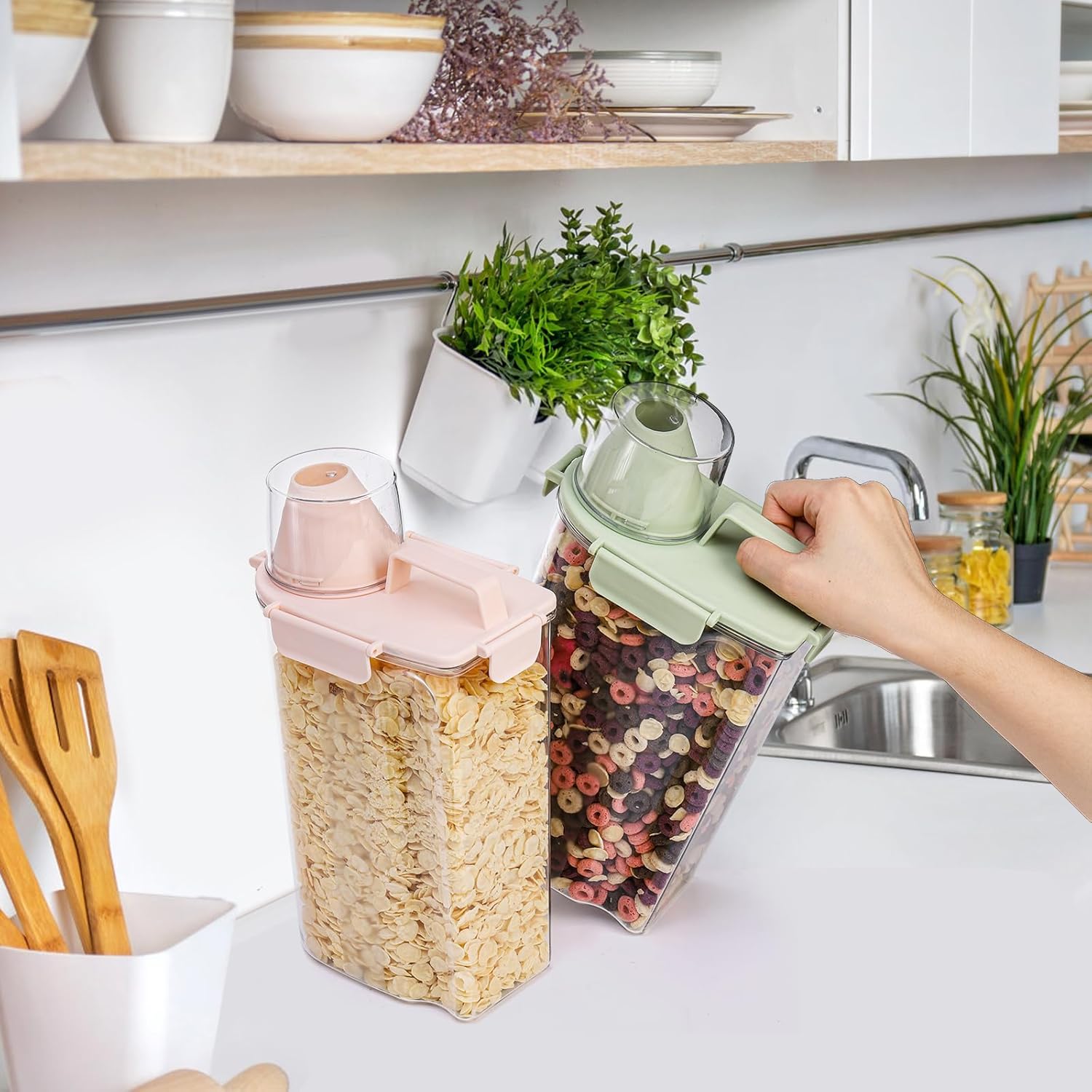 The dry food container is ideal for storing small pet food like kitten food, puppy kibble, bird seed, fish food etc., also can be used for regular kitchen food, such as rice, flour, cereal, beans, nuts, snacks, etc. (Note: Container storage capacity varies by food)