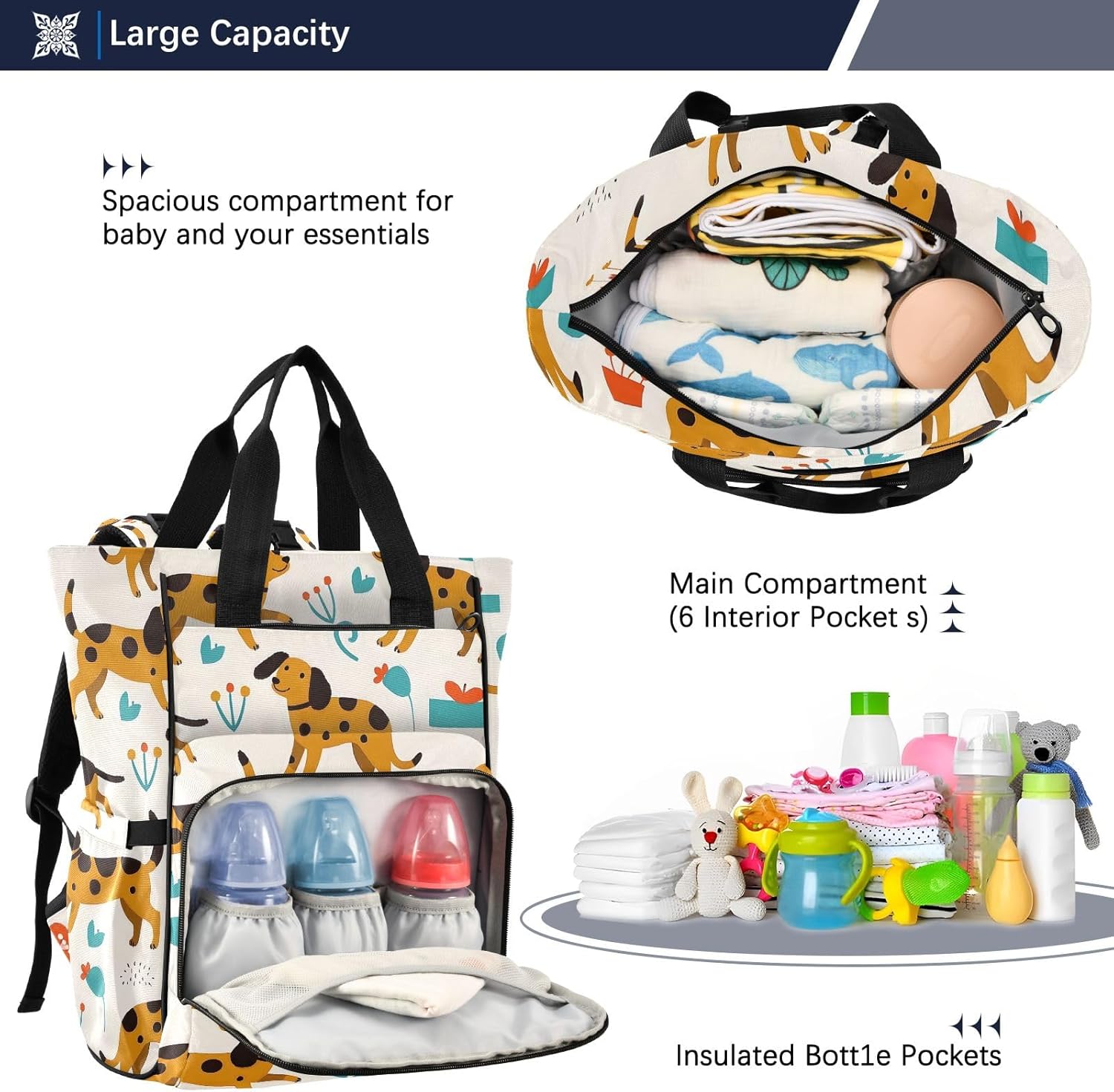 【Large Capacity】11*5.9*15.3in Baby bag includes 5 inner pockets in main compartment, 3 insulated pockets (Fit for All Major Baby Bottles) in front pocket, 2 side pockets, 1 backside pocket,1 mommy pocket, spacious enough to hold most of baby essentials and still look perfectly organized.