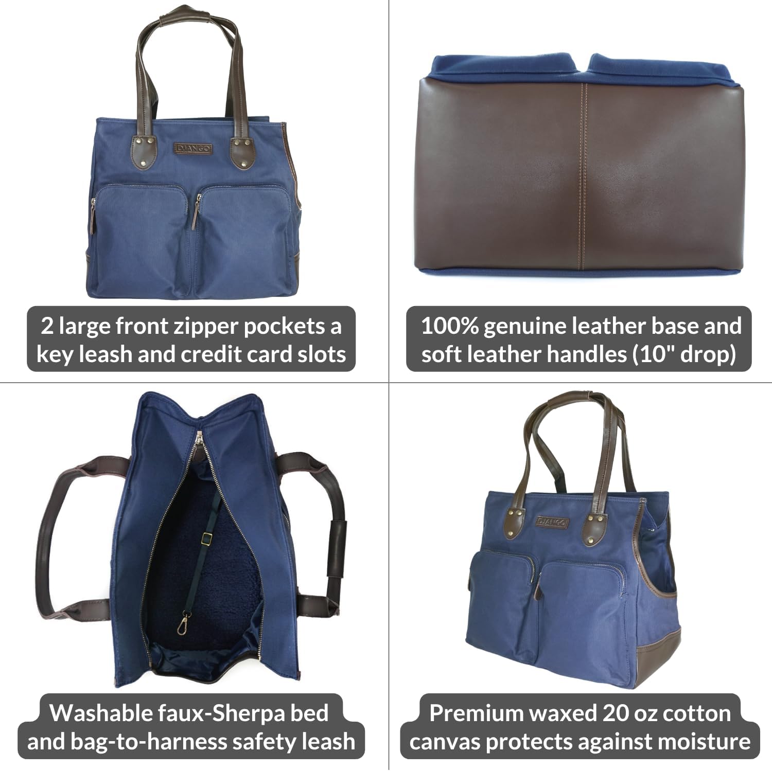 DJANGO Dog Carrier Bag Medium – Waxed Canvas and Leather Soft Dog Travel Carrier – Navy Blue Travel Tote Bag for Pets with Harness Safety Tether, Secure Zipper Pockets, and Water-Resistant Lining